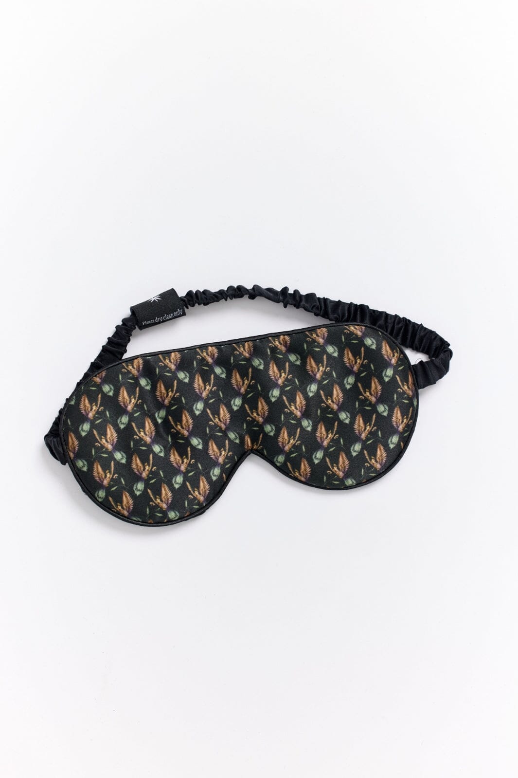 Czarna maska do spania od Fan Palm z wzorem kolibra i kwiatów. Maska wykonana jest z jedwabiu morwowego i jest dostarczana w dekoracyjnej pudełku, które chroni produkt.