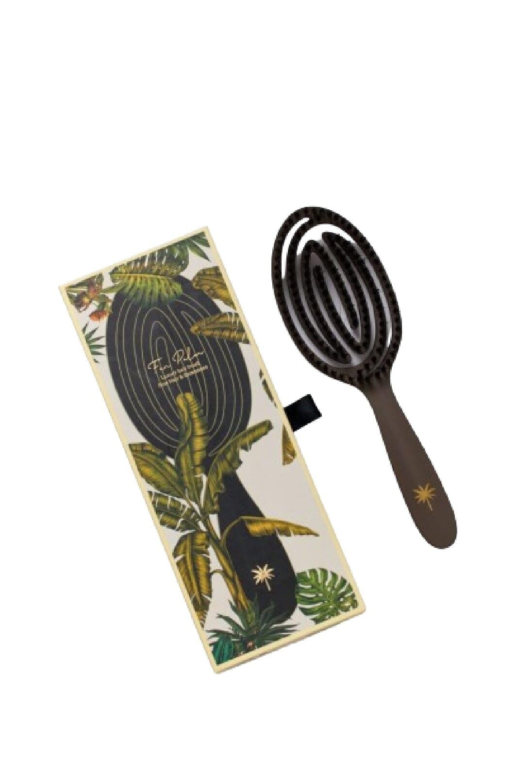 Szczotka do włosów od Fan Palm w ciepłym szarym kolorze. Szczotka, specjalnie zaprojektowana do cienkich włosów i przedłużeń, z połączeniem włosia dzika i szczotek nylonowych dla delikatnej pielęgnacji.