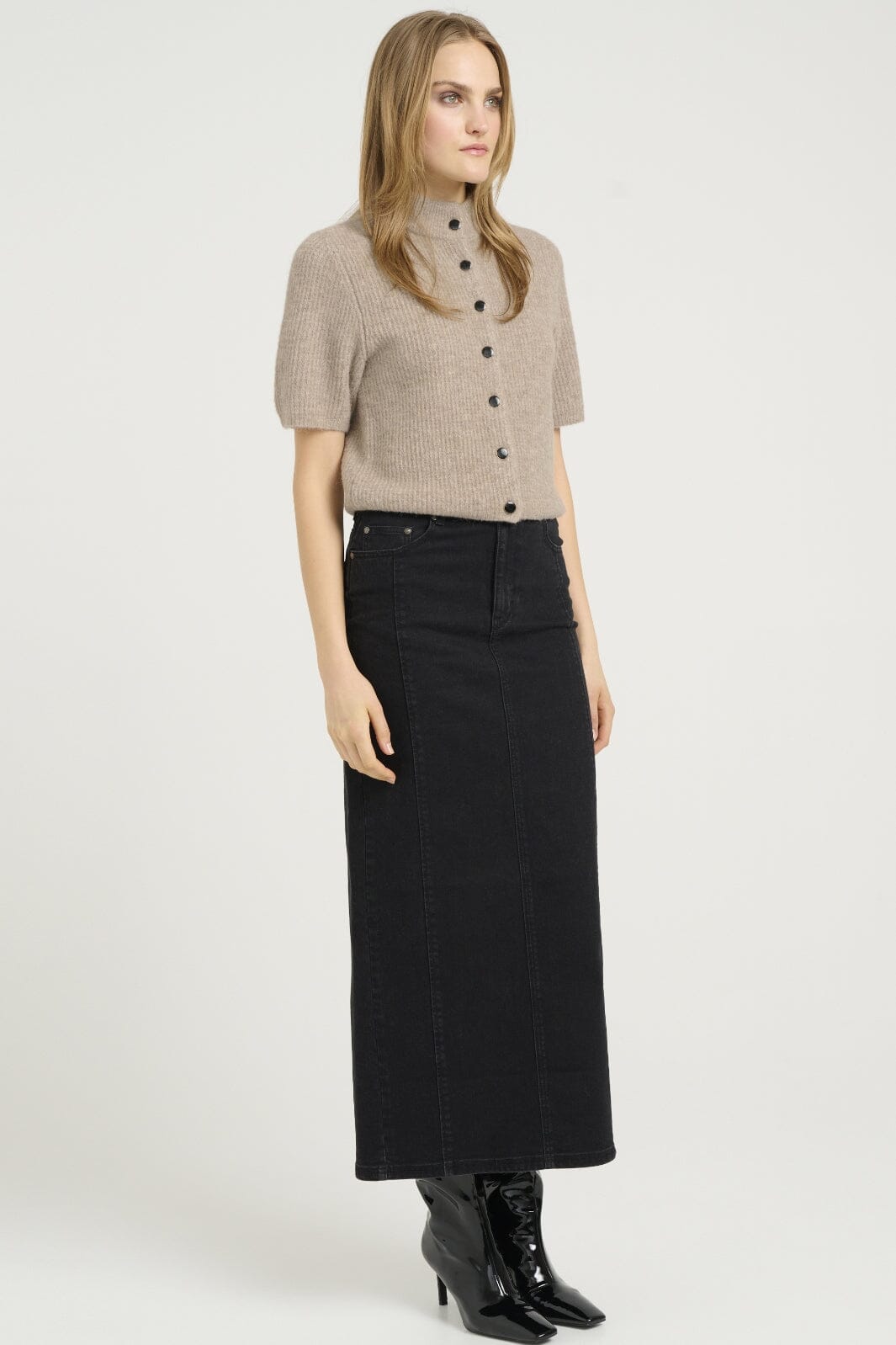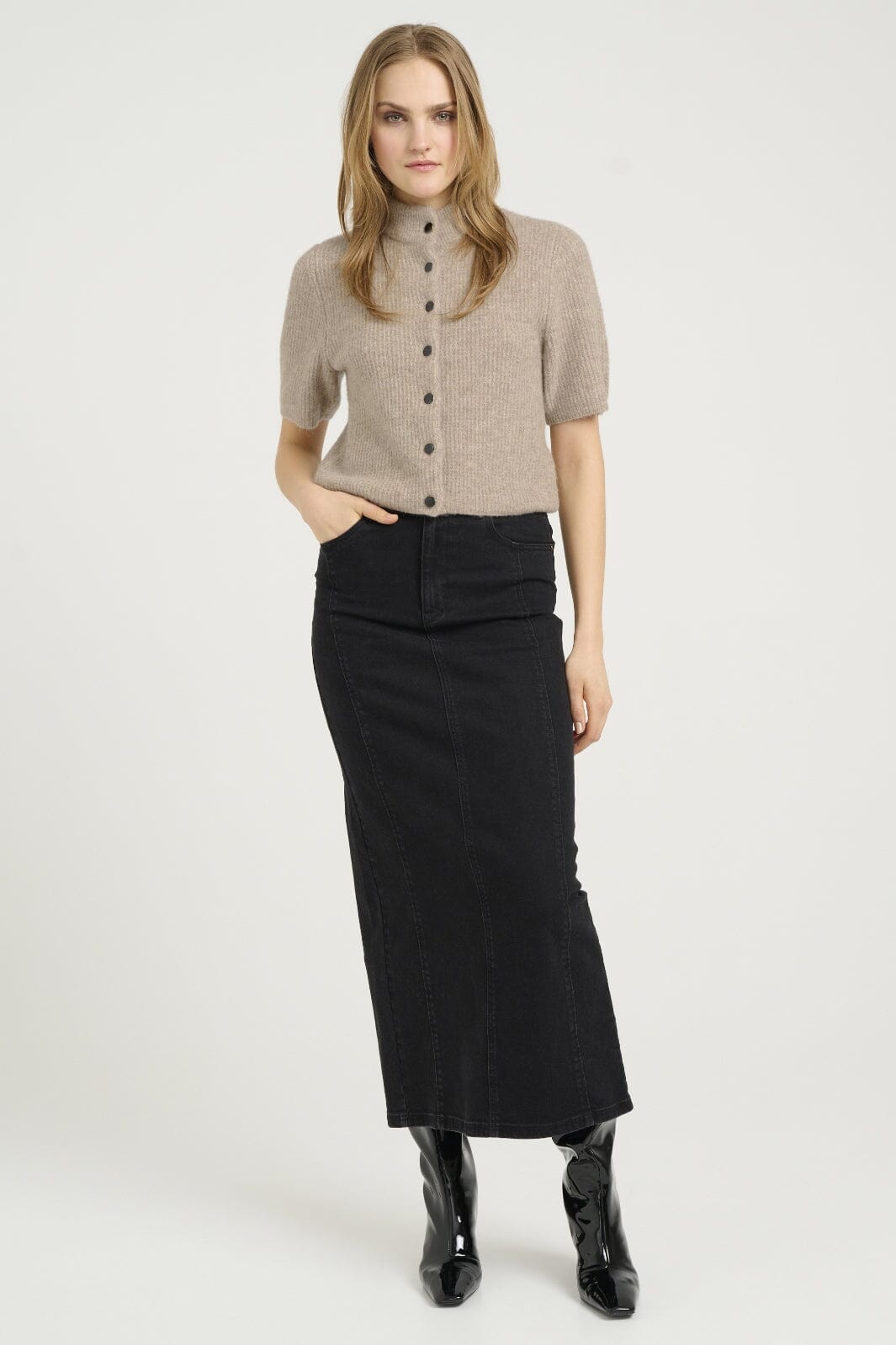 Krótki kardigan od Gestuz w ciepłym melanżu piaskowym. Ma wysoki kołnierz i krótkie rękawy z rzędem czarnych guzików z przodu. Dzianina ma miękką teksturę i regularny krój.