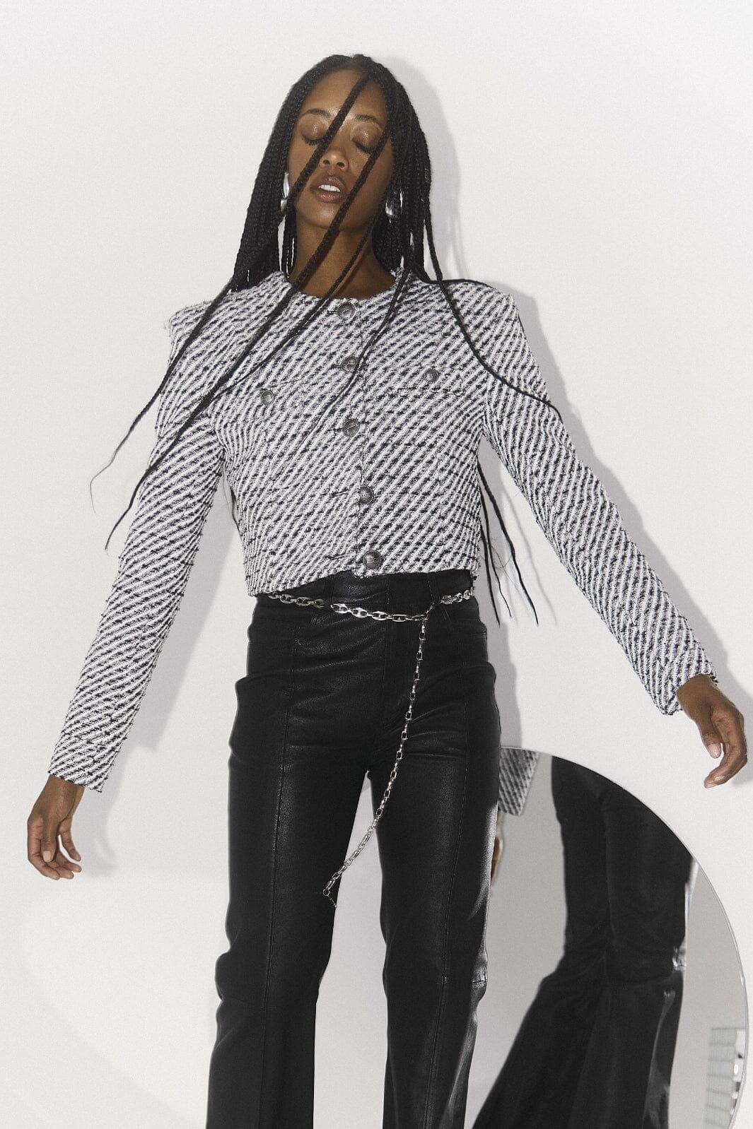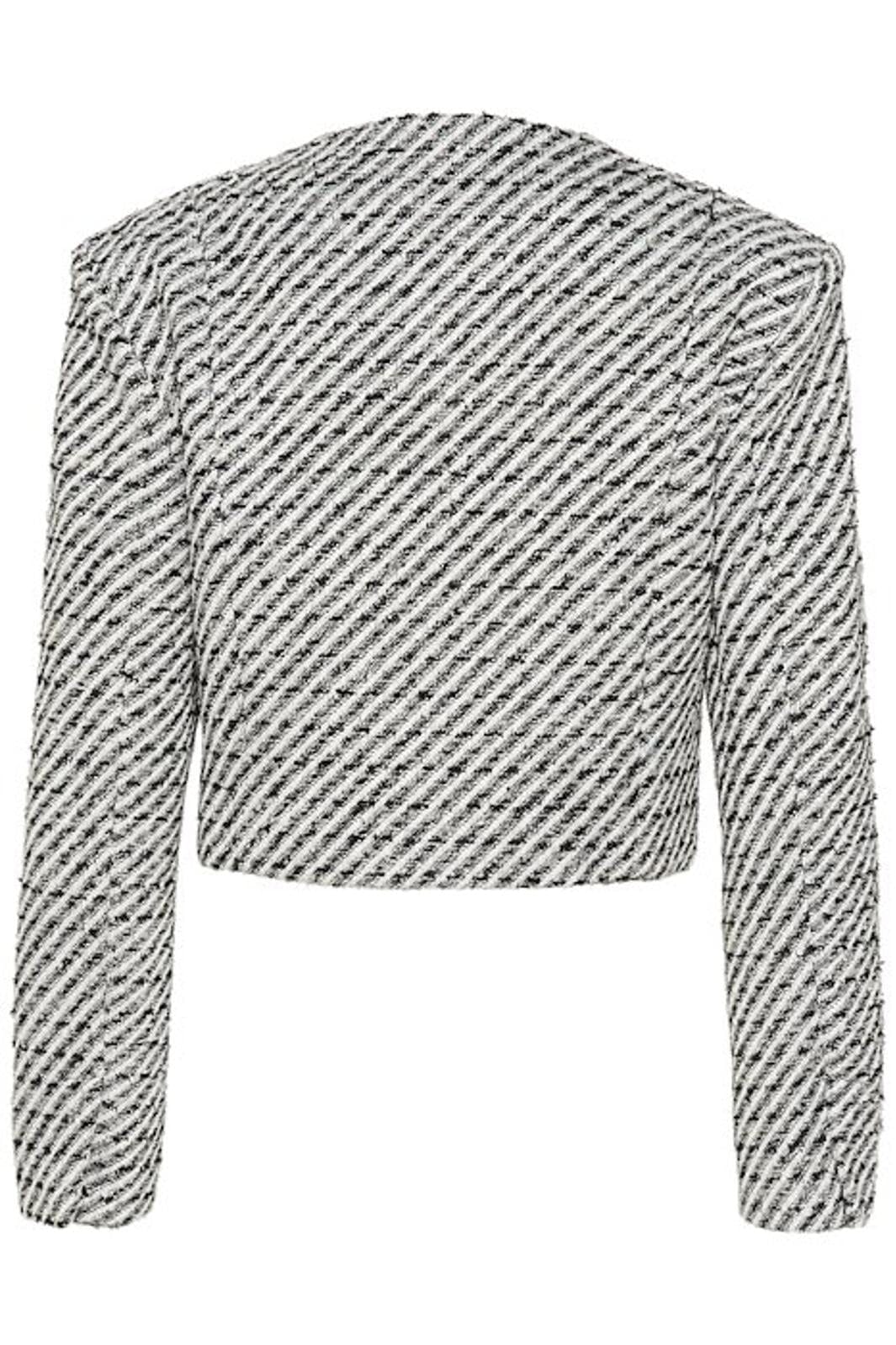 Czarna-biała krótka kurtka od Gestuz z ustrukturyzowanymi ramionami i paskami z lurex twill. Kurtka ma krótki fason i guziki z przodu.