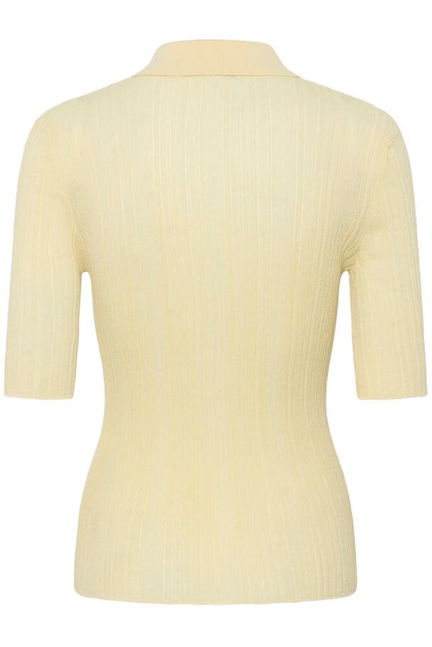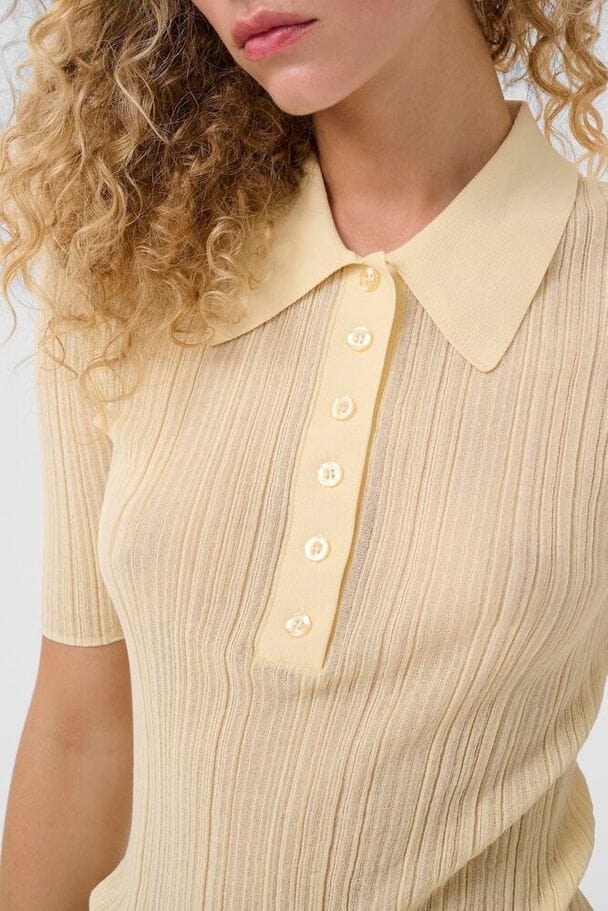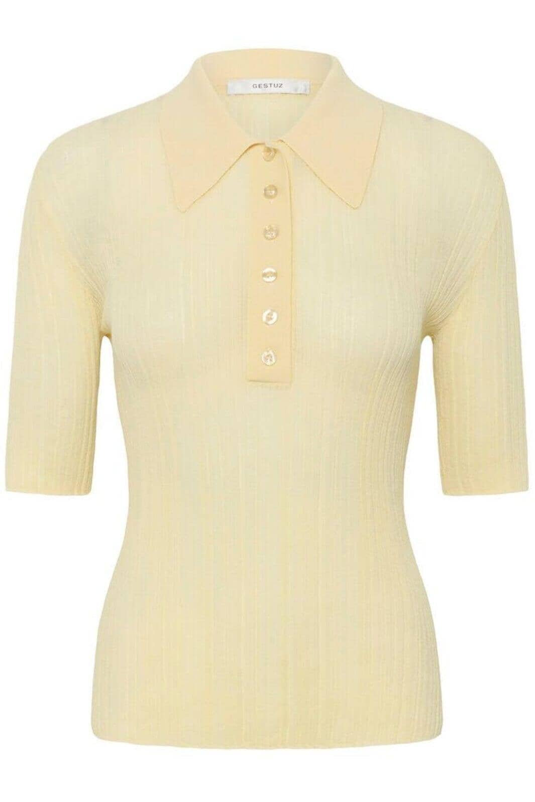 Prążkowany top polo marki Gestuz w jasnym kremowym kolorze. Top wykonany jest w 82% z bawełny i w 18% z poliamidu, z klasycznym kołnierzykiem i zapięciem na guziki.