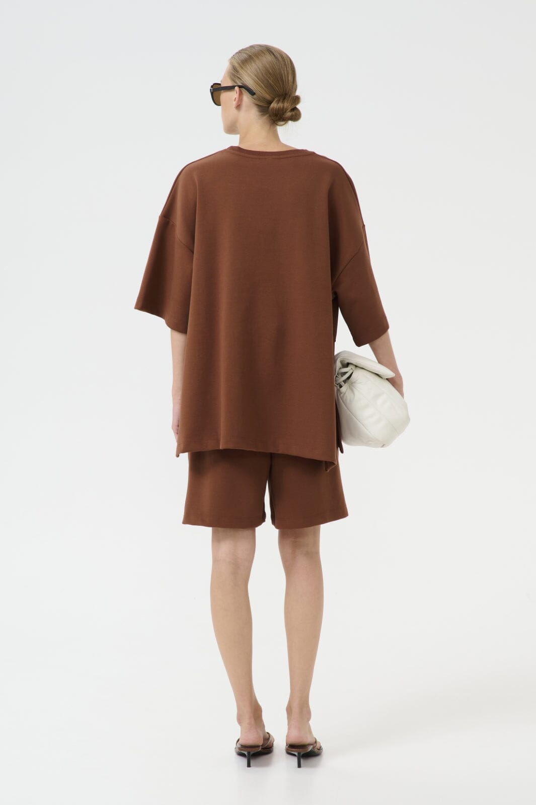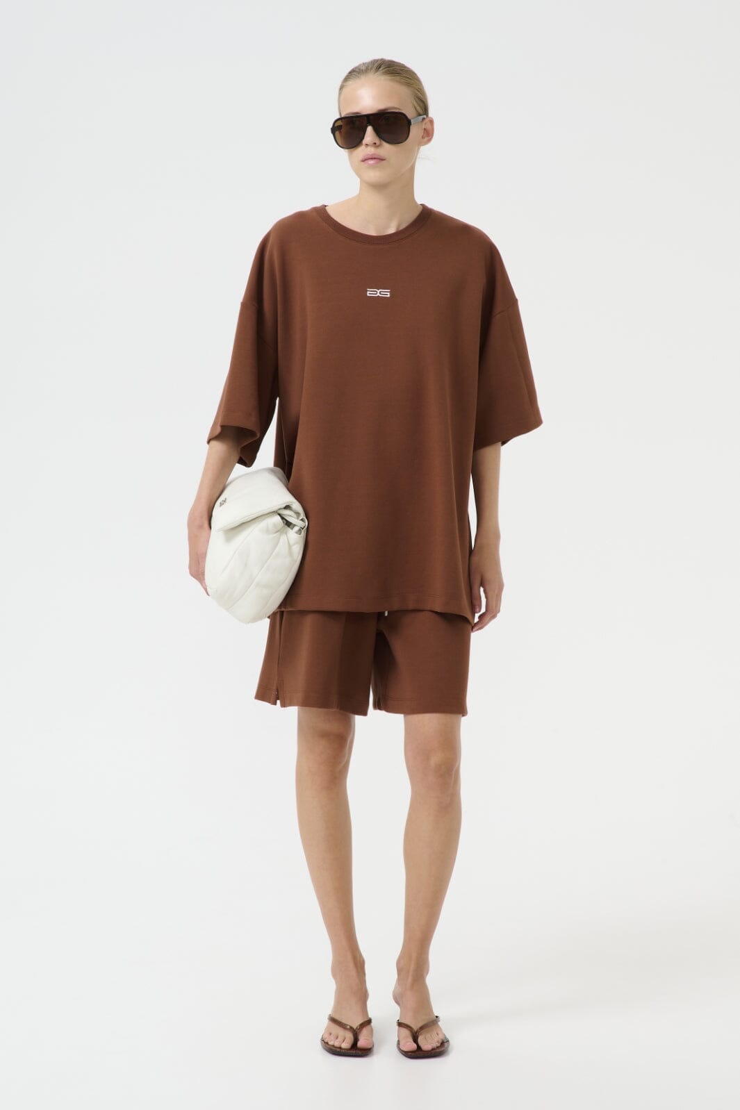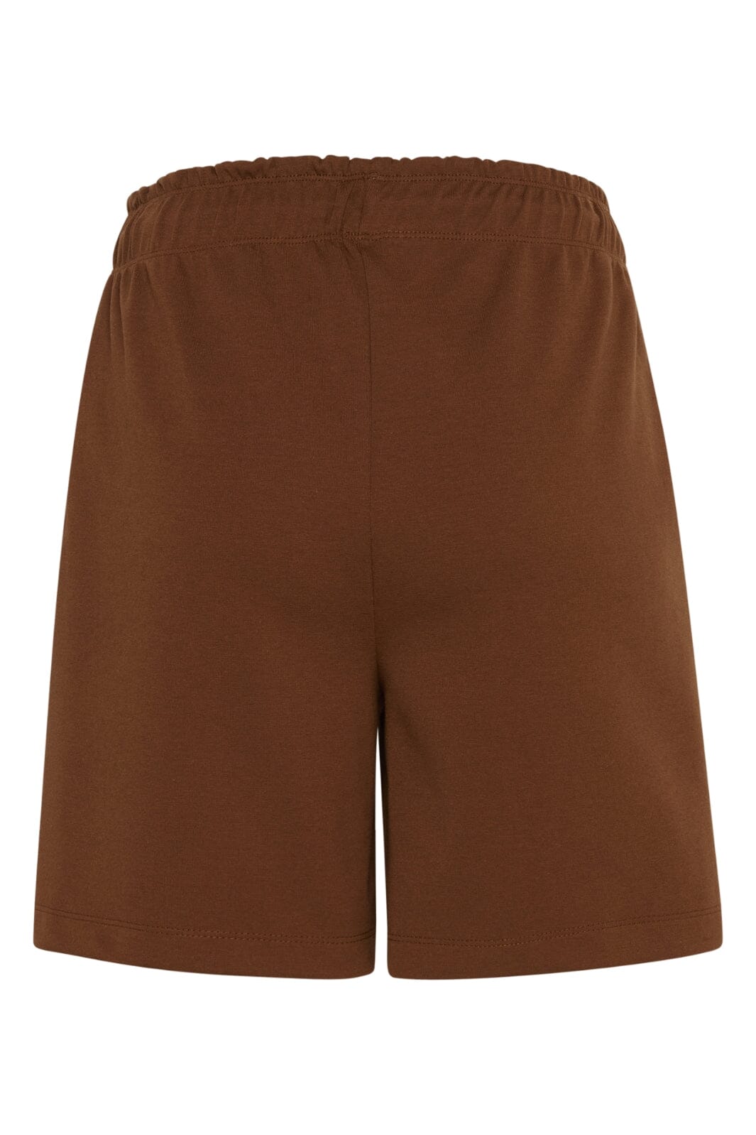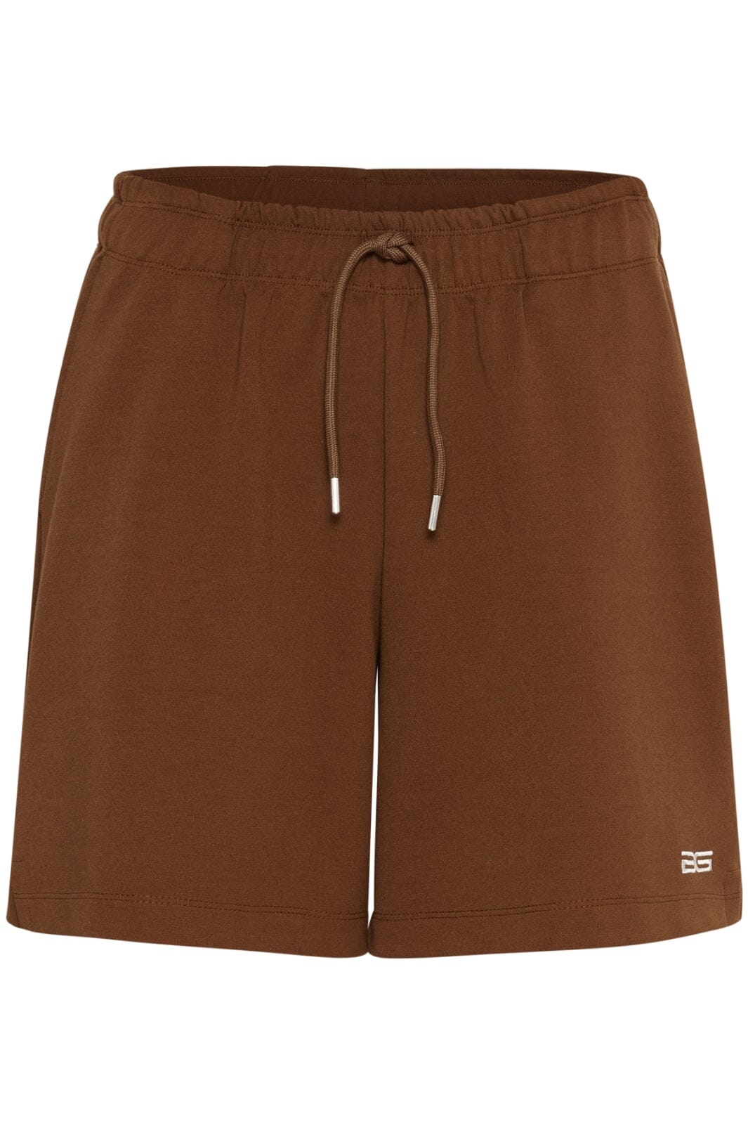 Brązowe szorty od Gestuz w ciepłym brązowym odcieniu. Szorty mają prosty design bez widocznych kieszeni oraz połączenie gumki i sznurka w talii.
