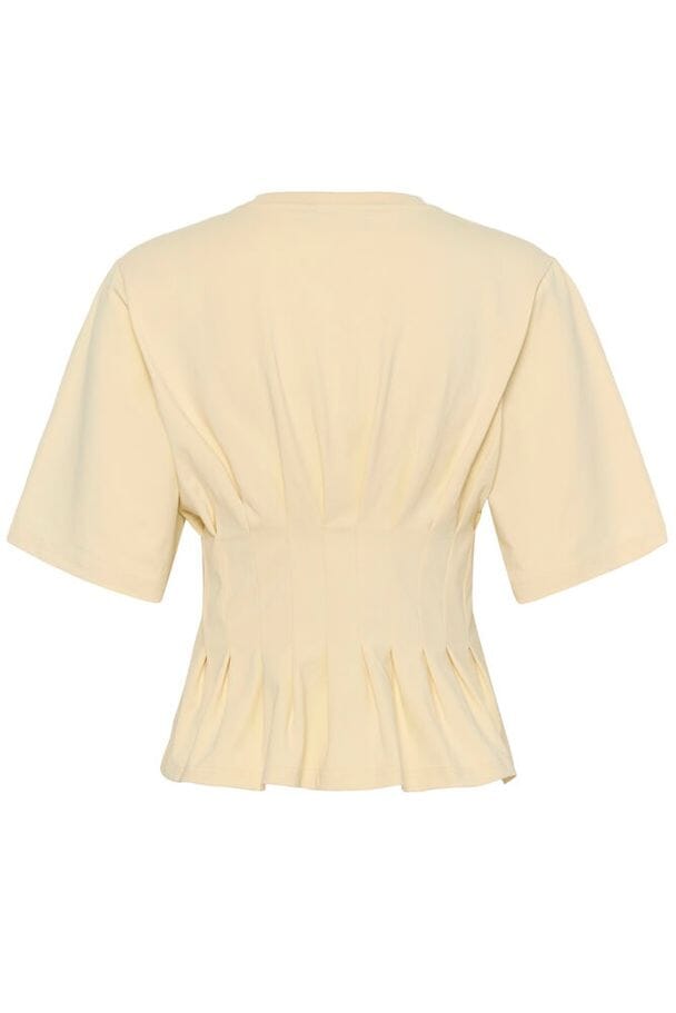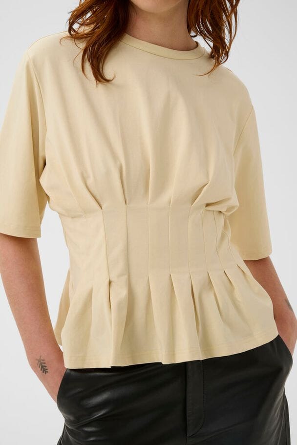Jasny kremowy t-shirt marki Gestuz z plisowanym detalem w okolicy talii. Ma krótkie rękawy i okrągły dekolt.