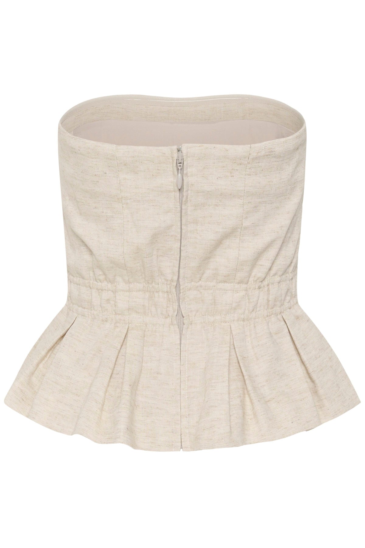 Gorsetowa bluzka bez ramiączek od Gestuz w jasnym piaskowym kolorze. Wykonana z mieszanki lyocellu i lnu z falbankowym peplumem u dołu.