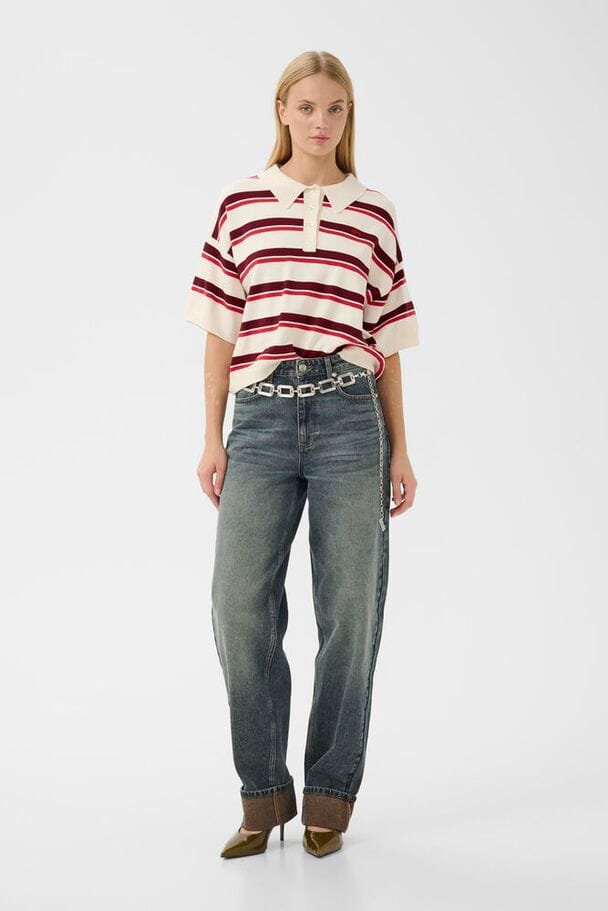 Pasiasty polo-sweterek od Gestuz w połączeniu odcieni off-white, burgundu i czerwieni. Sweterek ma krótkie rękawy i luźny krój.