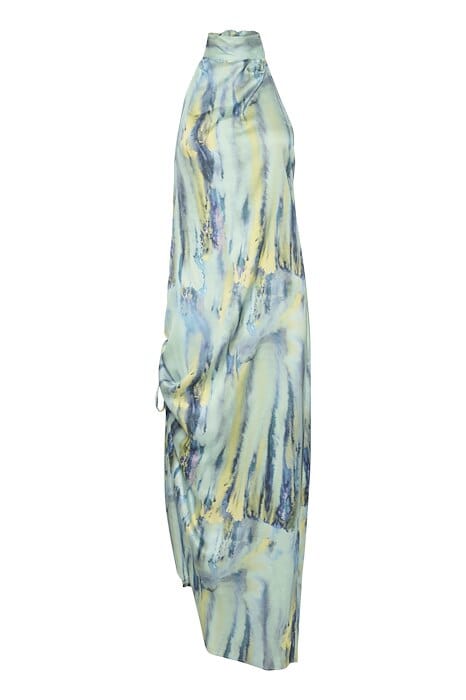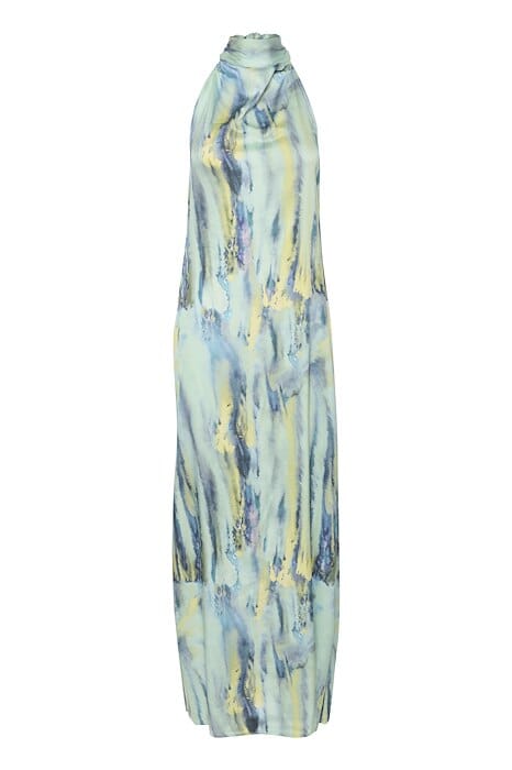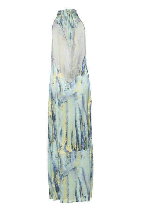 Maxi sukienka od Gestuz z akwarelowym wzorem w niebieskim, zielonym i żółtym. Sukienka ma projekt halterneck i luźny krój z wiązaniem na szyi.