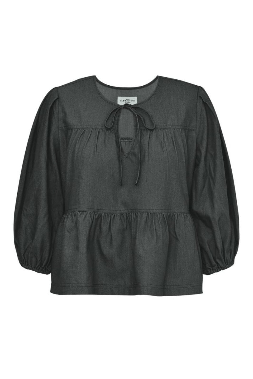Czarna bluzka od Global Funk z warstwowym designem i falbanami. Dekolt w serek z detalami sznurowania oraz rękawami puff z elastycznymi mankietami nadają bluzce kobiecy charakter.