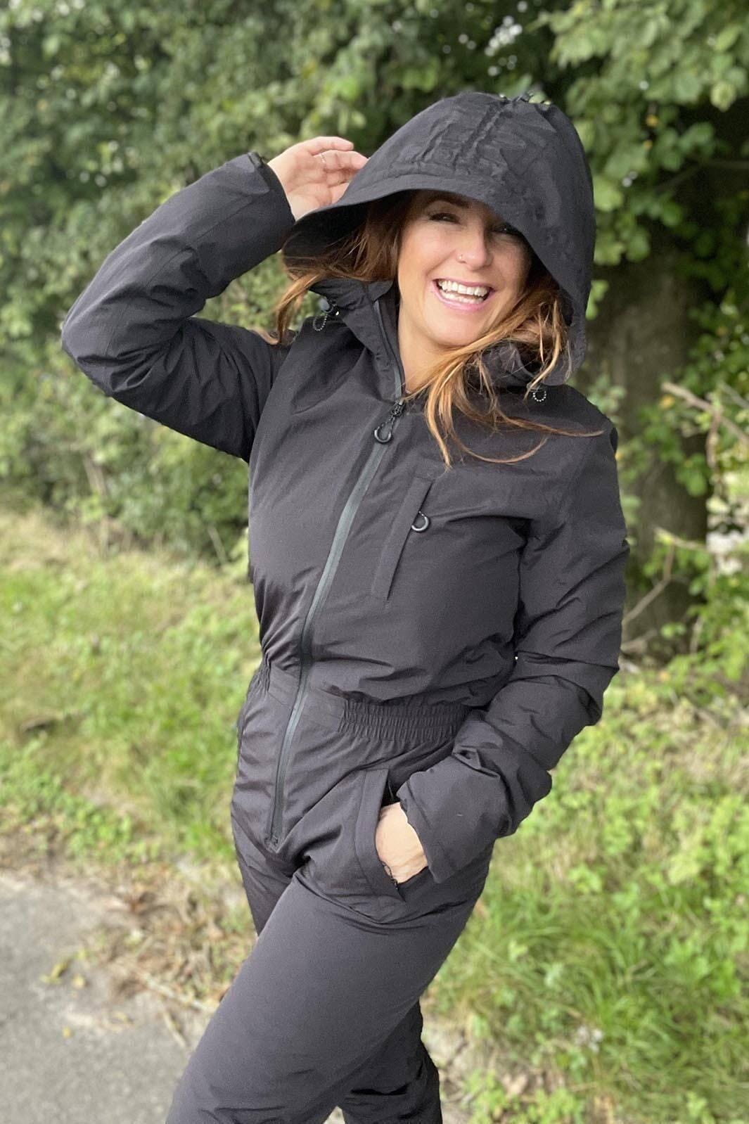 Czarny kombinezon z oddychającego materiału o właściwościach wodoodpornych. Kombinezon ma polarową podszewkę w górnej części ciała i kapturze oraz wypełnienie z poliestru w rękawach i nogawkach.