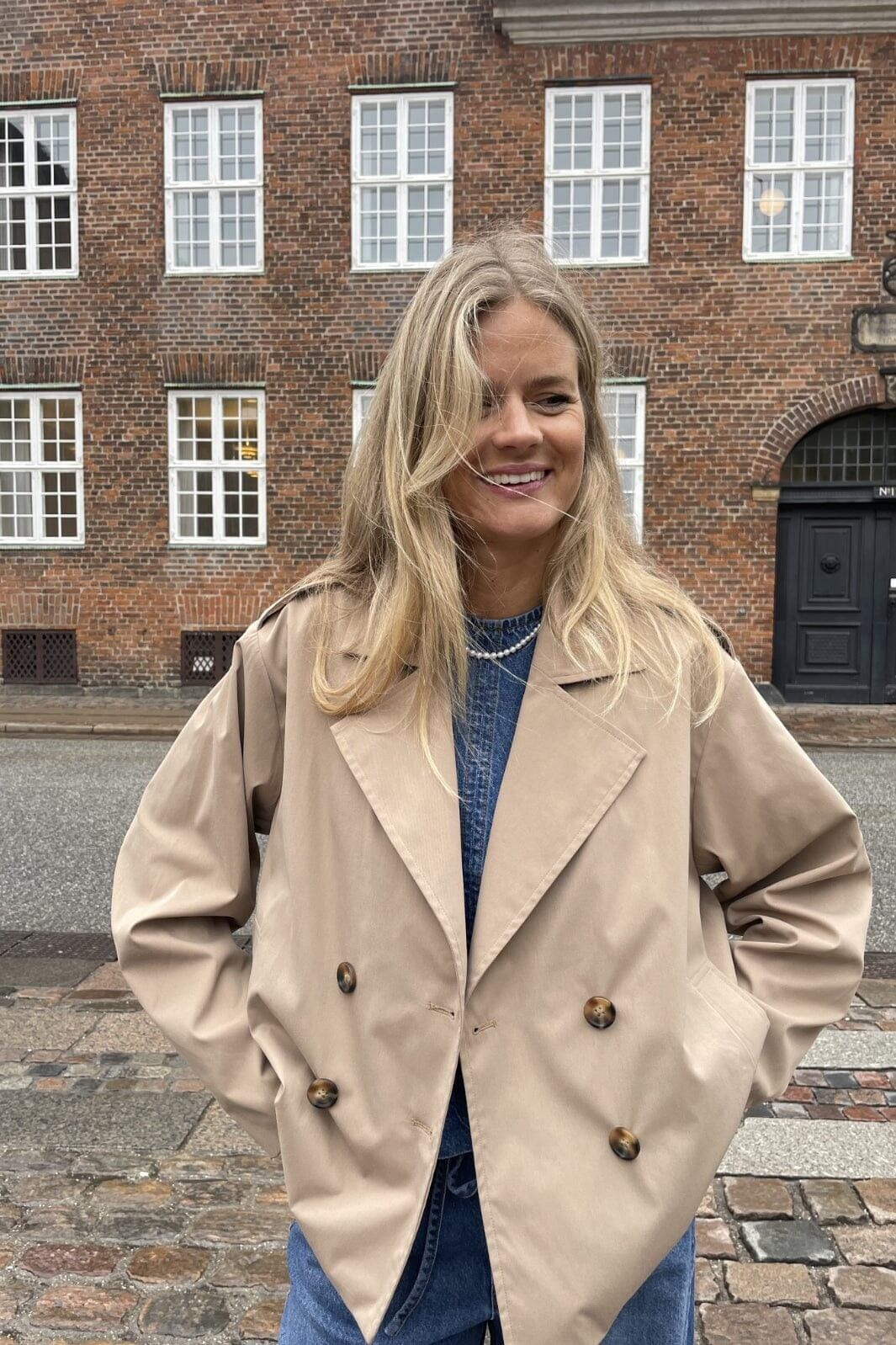Beżowa kurtka od Global Funk z podwójnym zapięciem. Ma duże guziki i klasyczny kołnierz, co nadaje kurtce czysty i prosty wygląd.