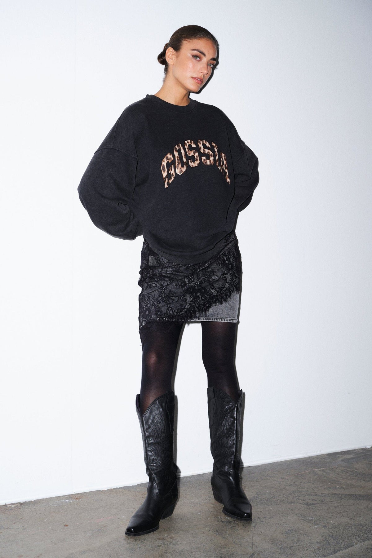 Szara, sprana dżinsowa spódnica marki Gossia z asymetryczną koronkową nakładką po lewej stronie. Spódnica ma zapięcie na guzik w pasie oraz widoczne kieszenie z przodu.