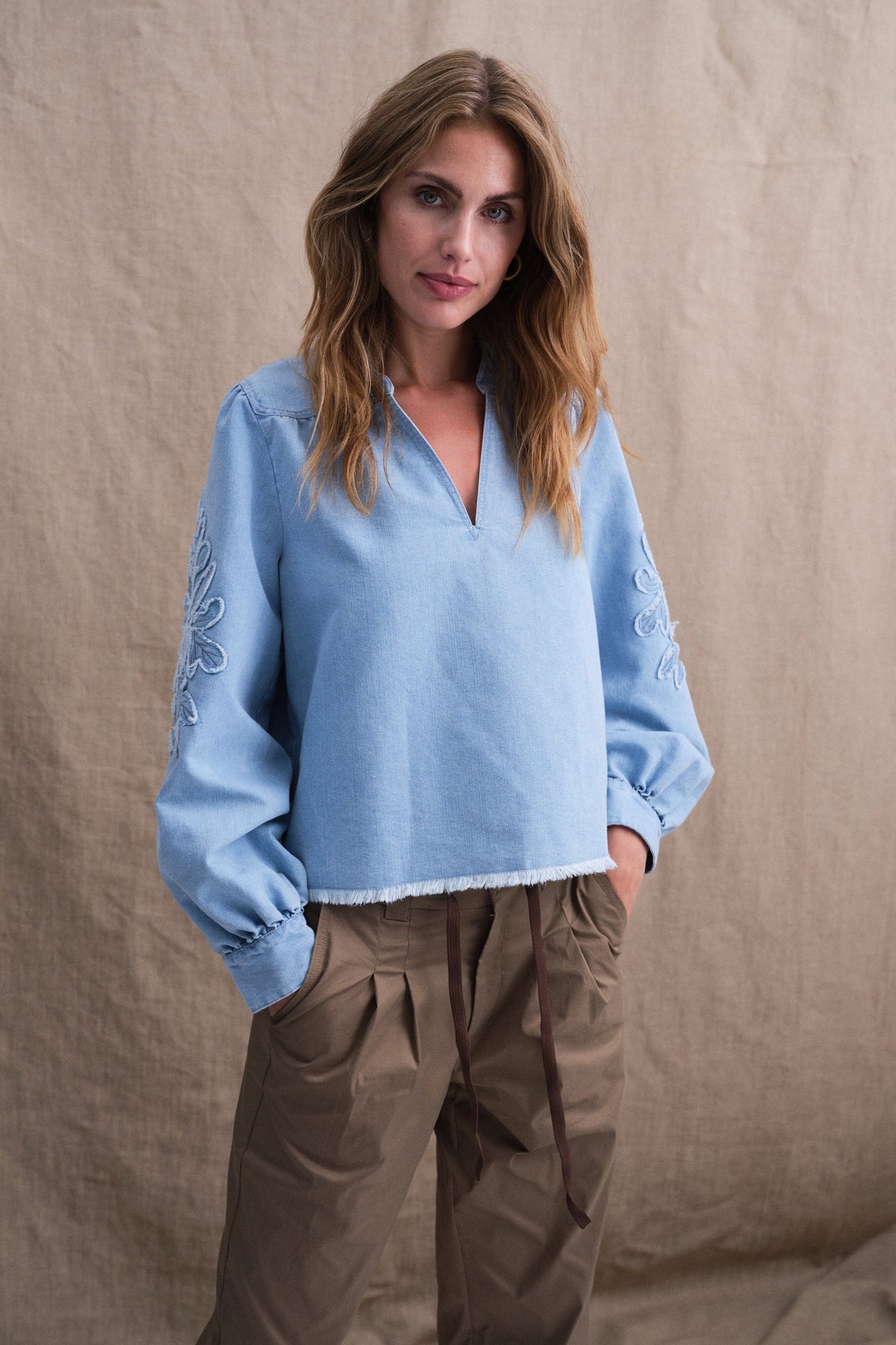 Bluzka Gossia z jasnoniebieskiego denimu. Bluzka ma haftowane kwiatowe detale na rękawach oraz dekolt w kształcie litery V z frędzlami u dołu.