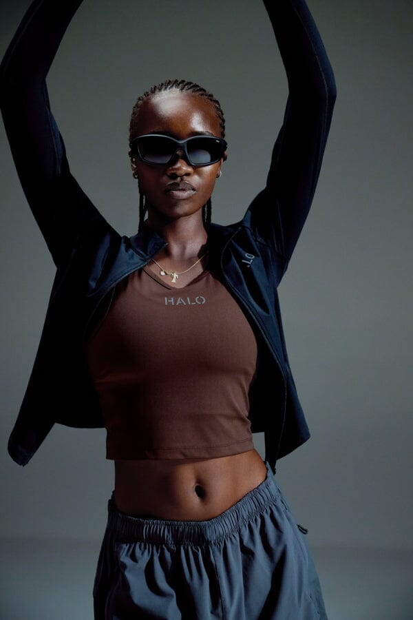Czarna bluza z zamkiem od HALO, wykonana z elastycznego poliamidu z dodatkiem elastanu. Bluza ma odblaskowy nadruk z logo HALO z przodu i logo ATW z tyłu.
