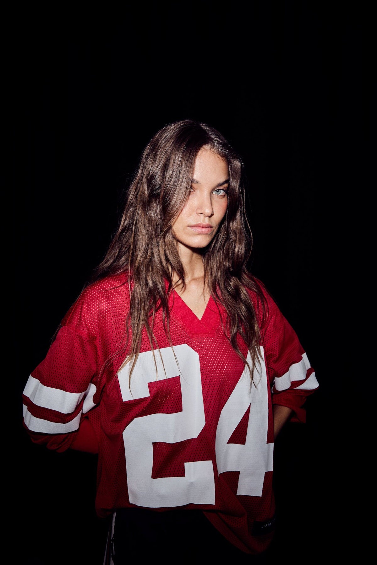 Czerwona koszulka z długim rękawem od Haute L'Amitié z siateczkowej tkaniny, z dużym białym numerem 24 z przodu i dwoma białymi paskami na rękawach.