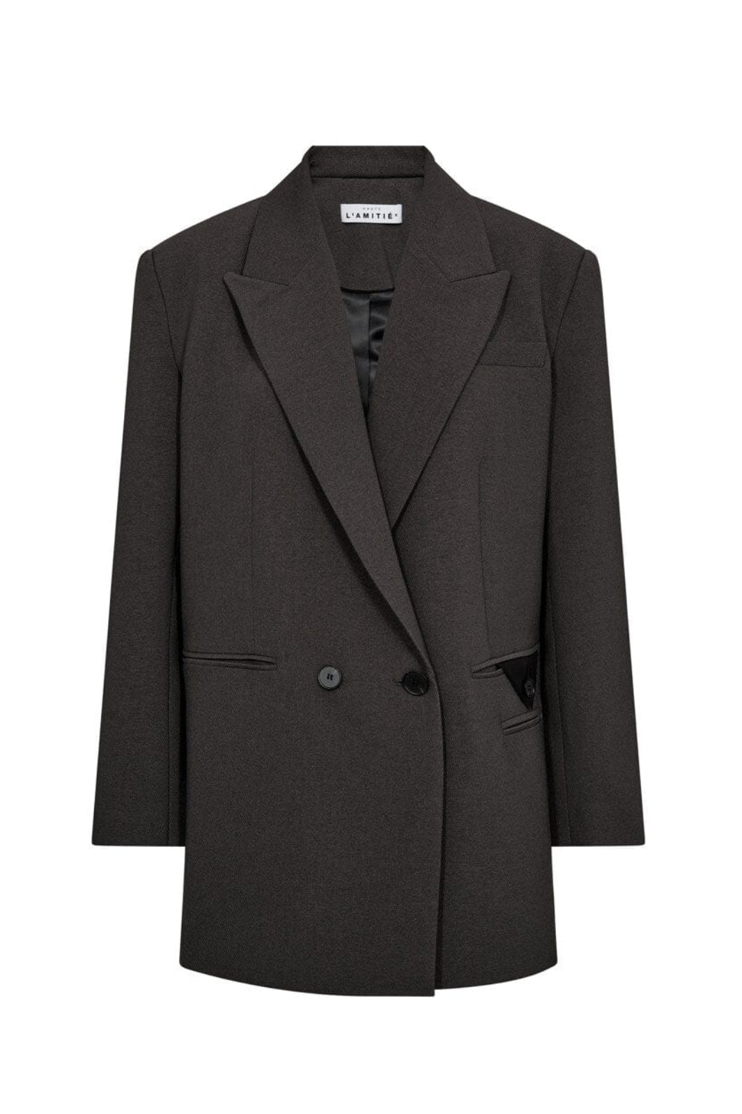 Oversize’owa marynarka od Haute L'Amitié w ciemnoszarym kolorze. Marynarka ma dwurzędowy przód z dwoma widocznymi guzikami oraz szerokie klapy.