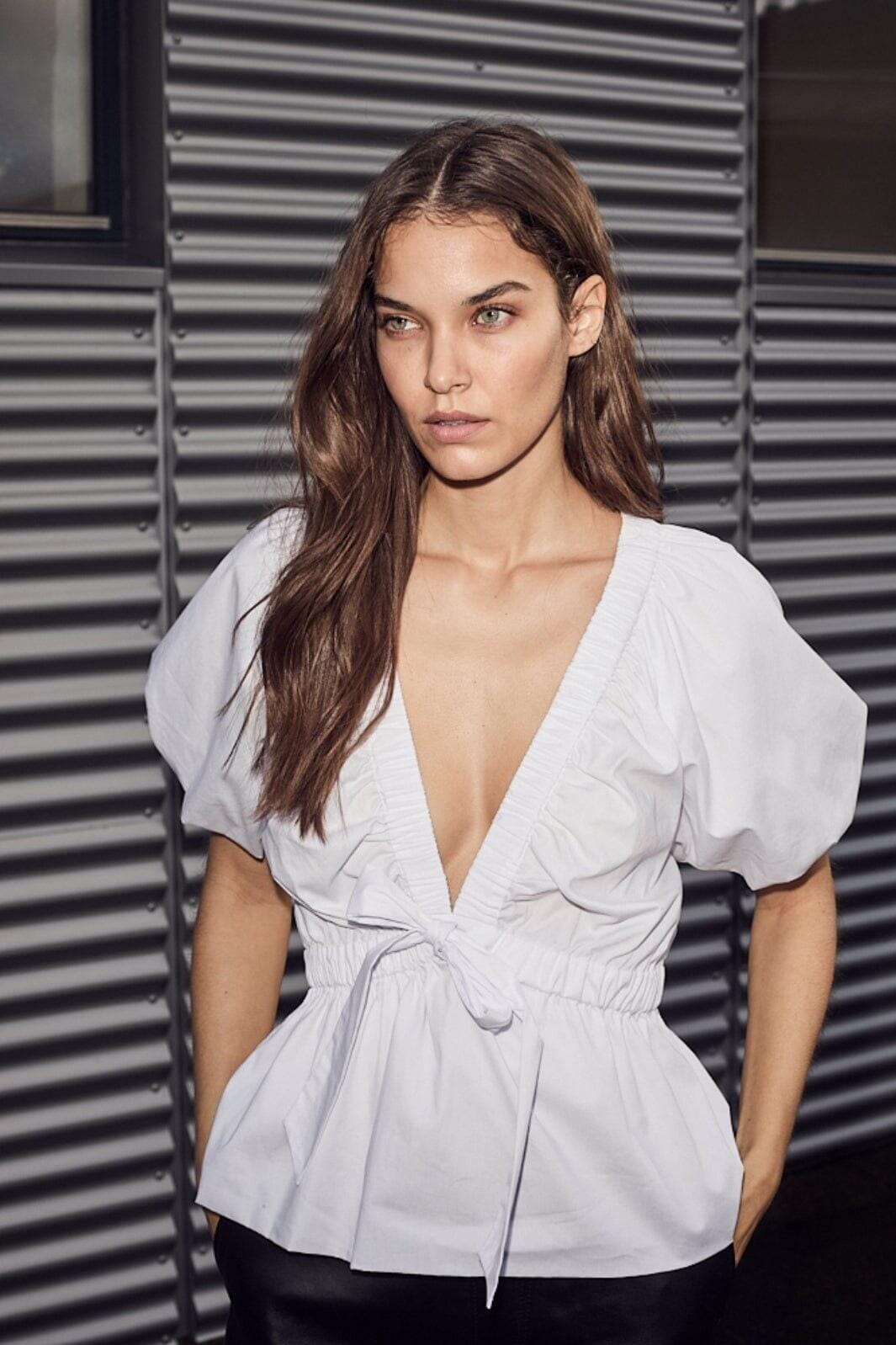 Biała bluzka od Haute L'Amitié z bufiastymi rękawami i głębokim dekoltem w kształcie litery V. Mieszanka bawełny sprawia, że bluzka jest miękka i przyjemna w noszeniu. Pasek w talii można zawiązać, aby dopasować krój.