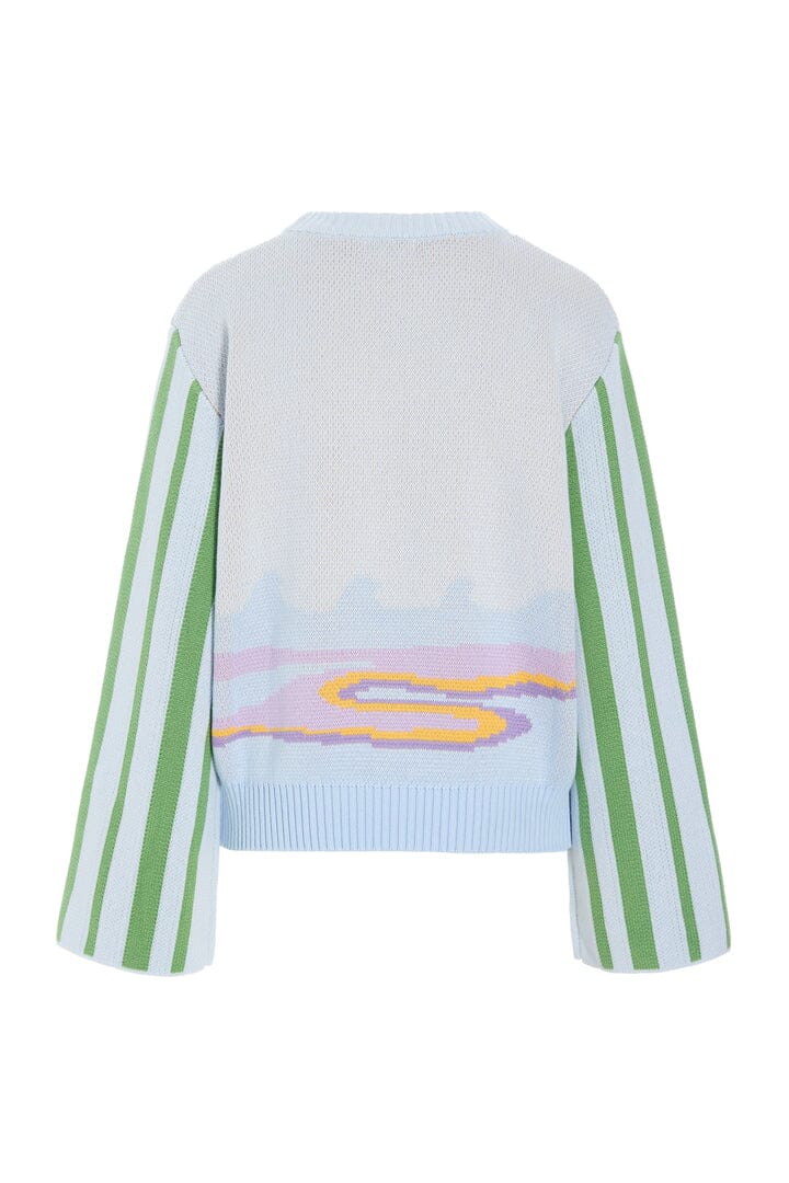 Bluzka od Hunkøn w kolorze Blue Sea. Z przodu ma haftowany motyw słońca i łódki oraz pionowe paski na rękawach.