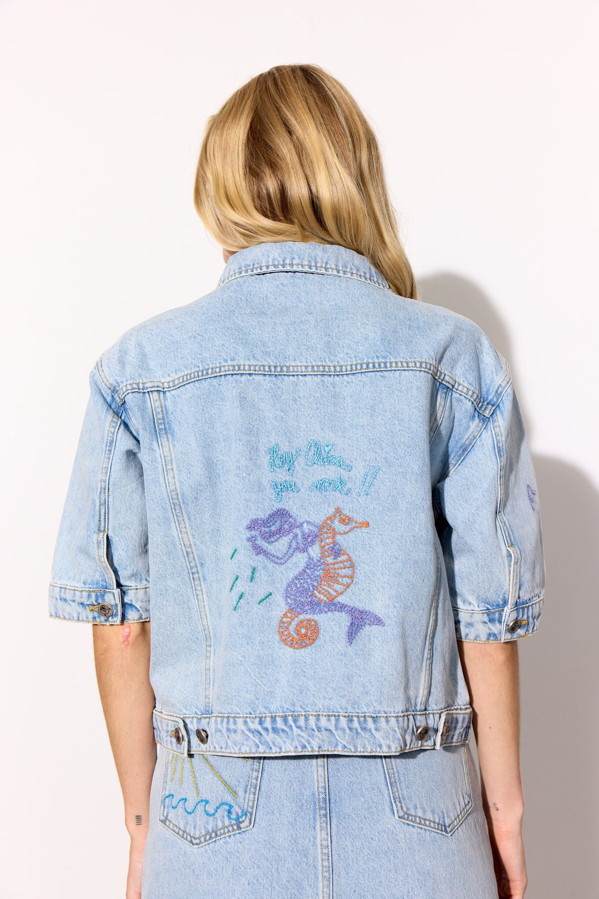 Kurtka dżinsowa Hunkøn z jasnego denimu z haftowanymi motywami i falami z przodu i z tyłu. Kurtka ma luźny krój i krótkie rękawy.