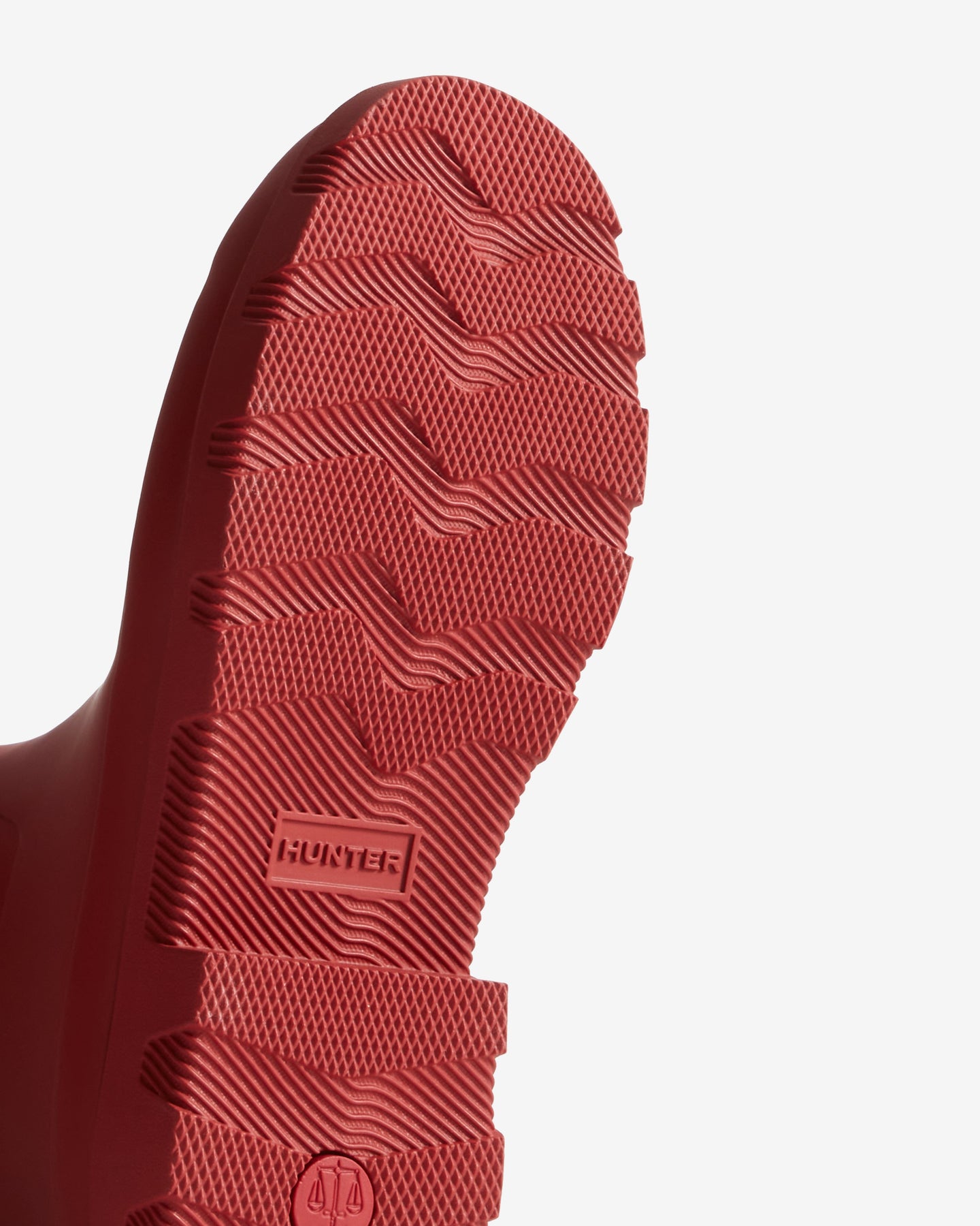 Krótki kalosz marki Hunter w odcieniu militarnej czerwieni. Kalosz wykonany jest w 100% z gumy i ma logo Hunter z przodu.