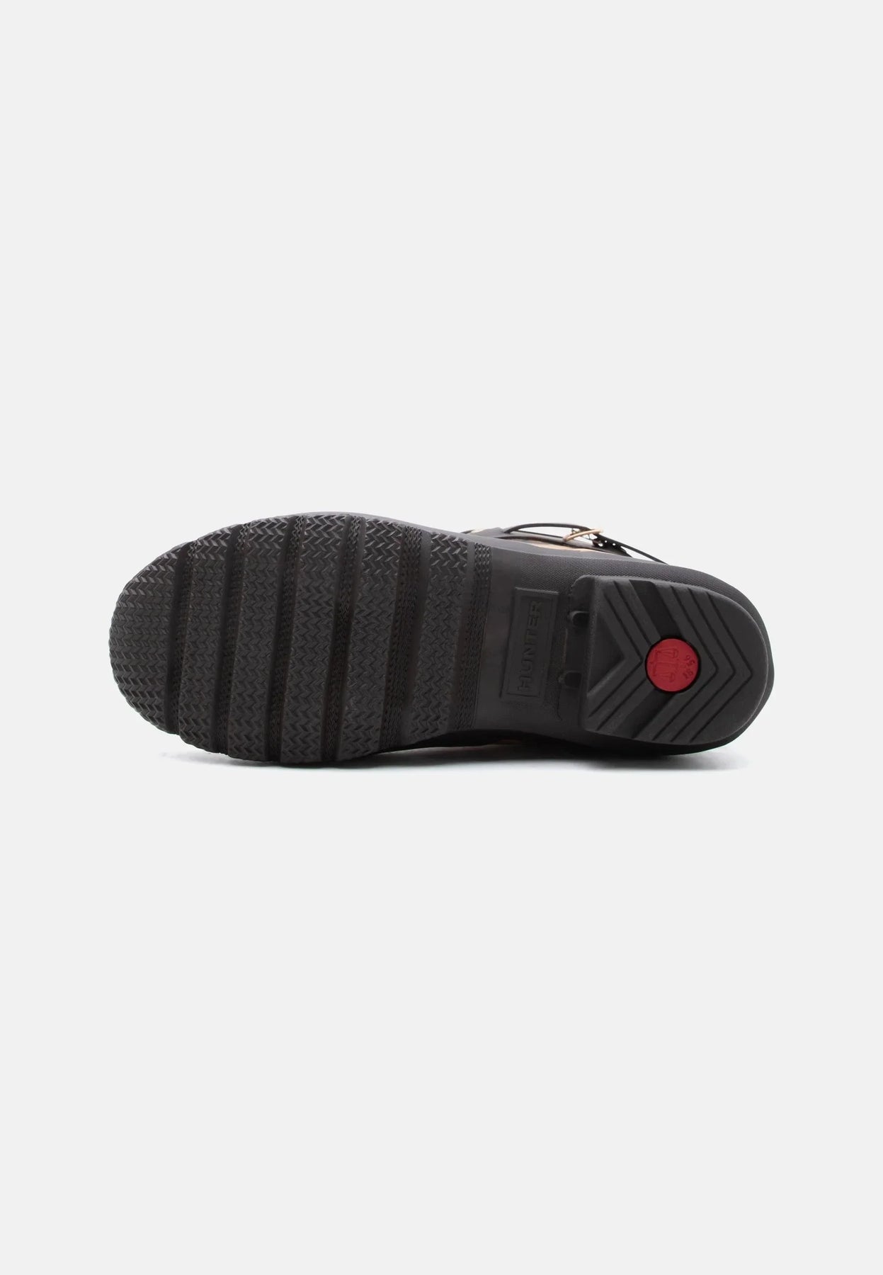 Krótkie kalosze marki Hunter z nadrukiem w panterkę w odcieniach brązu i czekoladowego brązu. Buty zostały zaprojektowane do codziennego użytku.