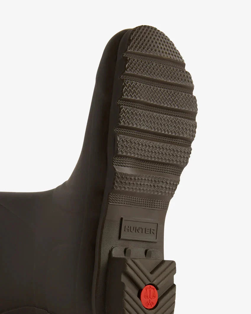 Wysokie kalosze Hunter w czekoladowobrązowym kolorze. Buty wykonane są z gumy i mają klasyczny fason z okrągłym noskiem.