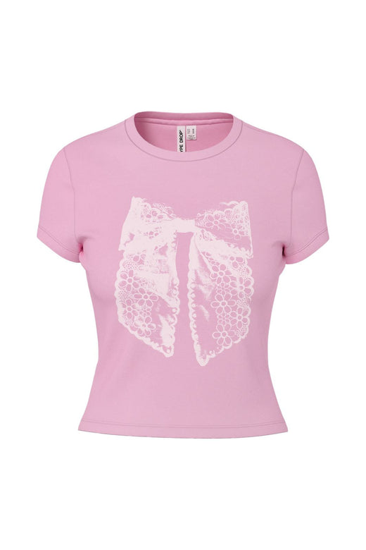 Różowy krótki t-shirt od Hypedrop z białym nadrukiem kokardy i kwiatów z przodu. T-shirt ma krótkie rękawy i okrągły dekolt.