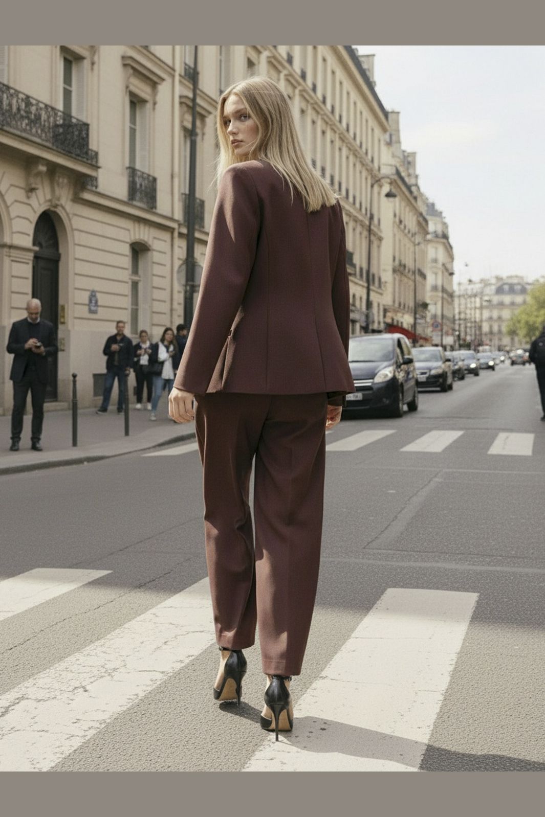 Brązowe spodnie garniturowe od Hypedrop z wysokim stanem i fasonem barrel-fit. Spodnie mają zapięcie na guzik i zamek błyskawiczny oraz szlufki na pasek w talii i praktyczne kieszenie boczne.