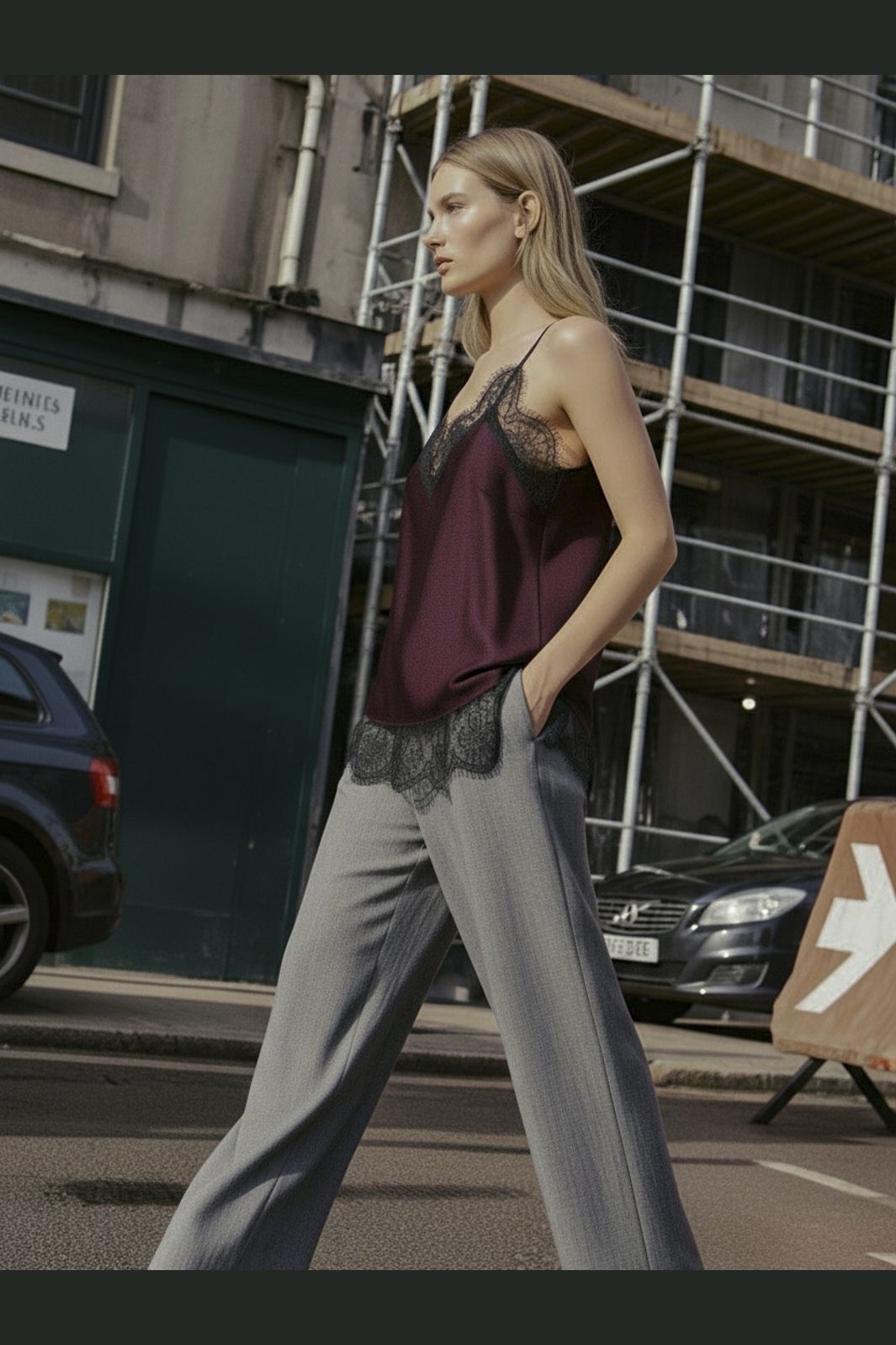 - Dekolt w kształcie V z detalami koronkowymi