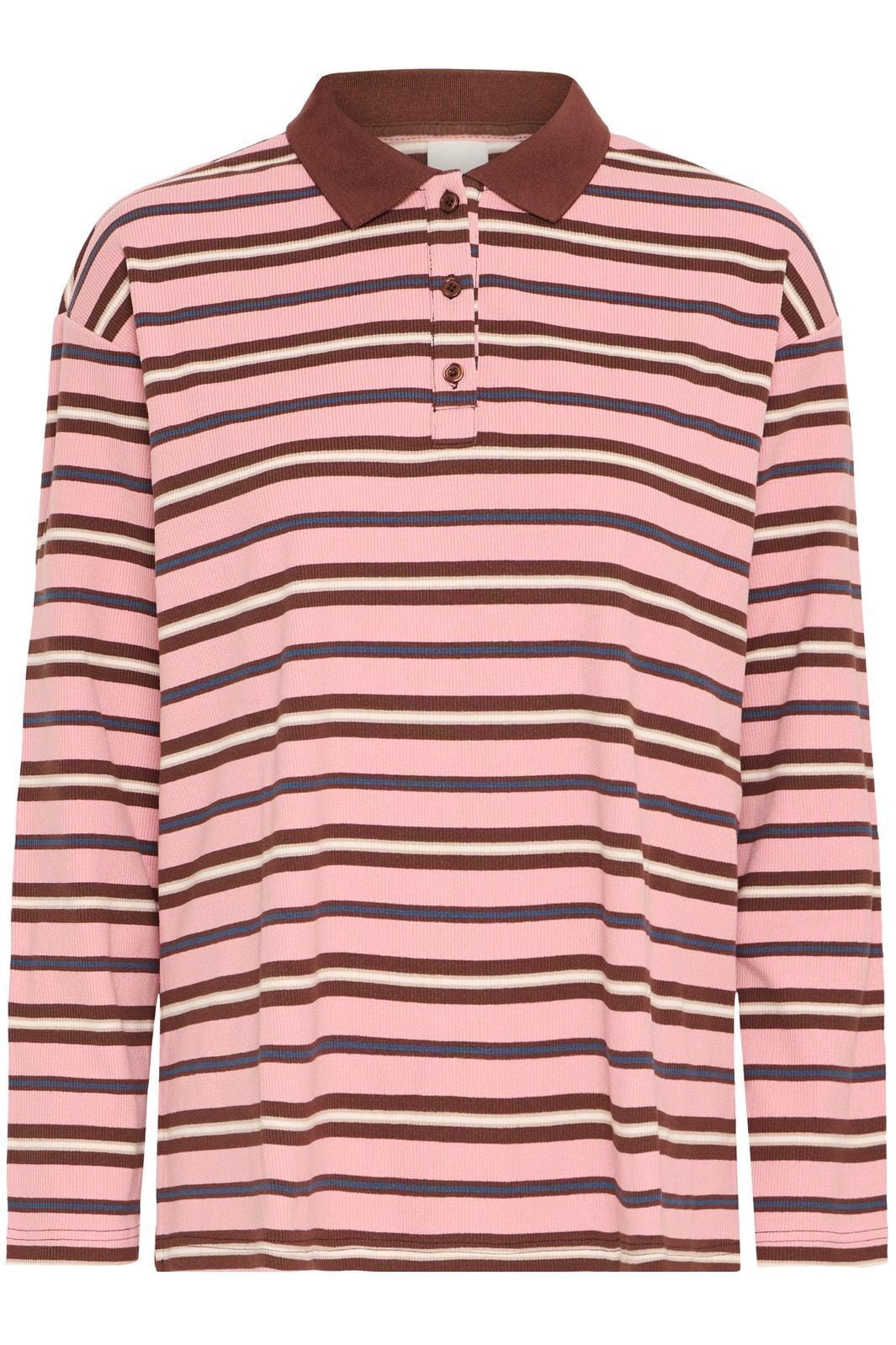 Polo z długim rękawem od Ichi w paski w kolorze różowym, brązowym i niebieskim. Koszula ma klasyczny kołnierzyk polo z zapięciem na guziki i poziome paski.