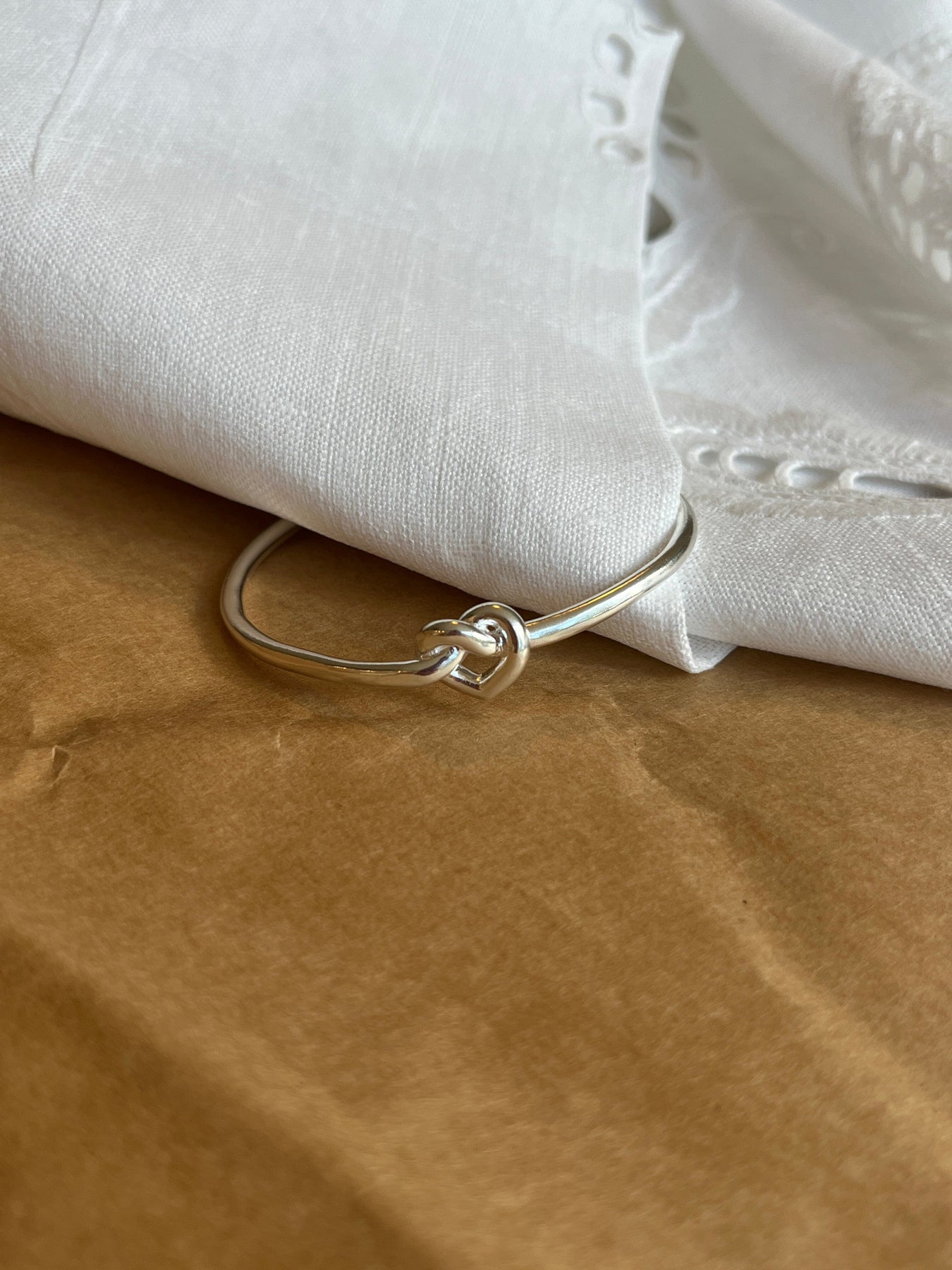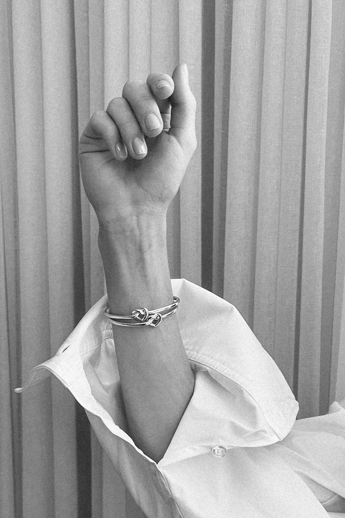Bransoletka od Jane Kønig z związanym sercem jako centralnym detalem. Bransoletka wykonana jest ze srebra próby 925 i ma gładką, lśniącą powierzchnię pokrytą 18-karatowym złotem.