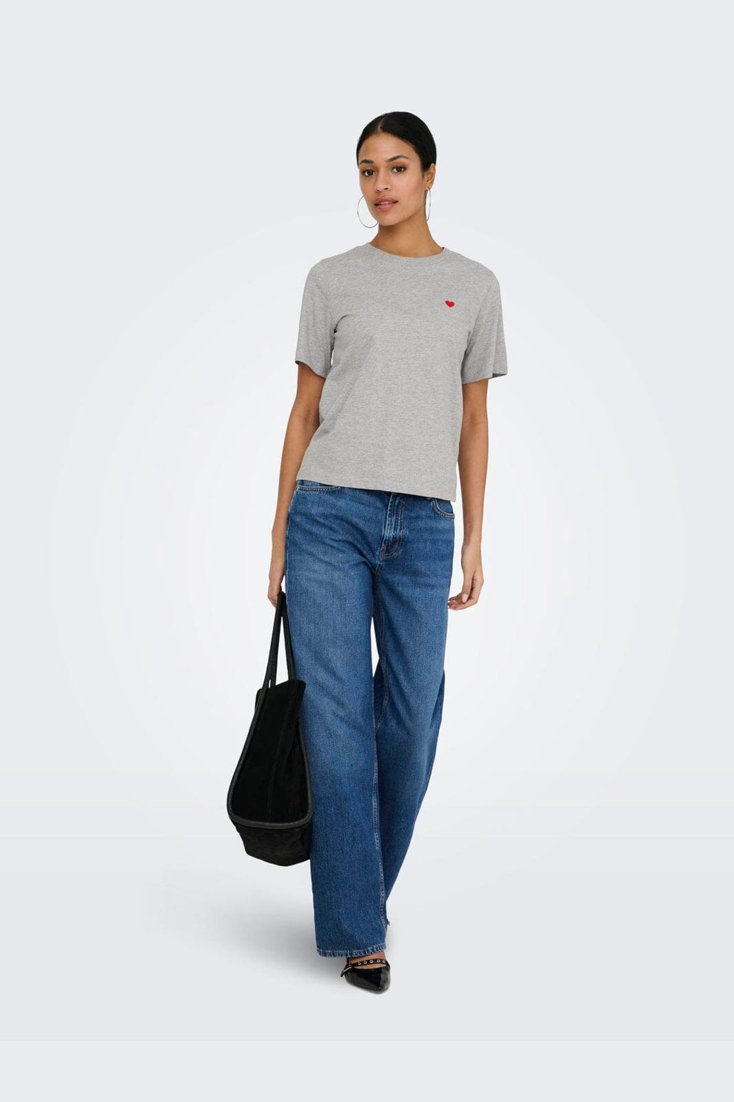 Bluzka z krótkim rękawem od JDY, wykonana z bawełny w jasnoszarym melanżowym odcieniu. Bluzka ma małe czerwone serce wyhaftowane na piersi.