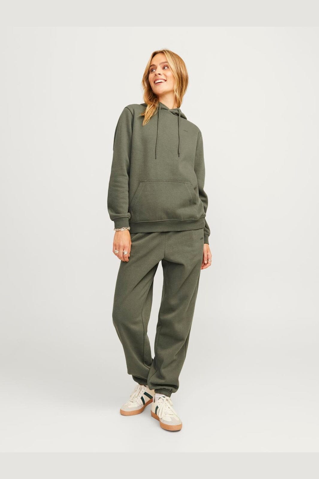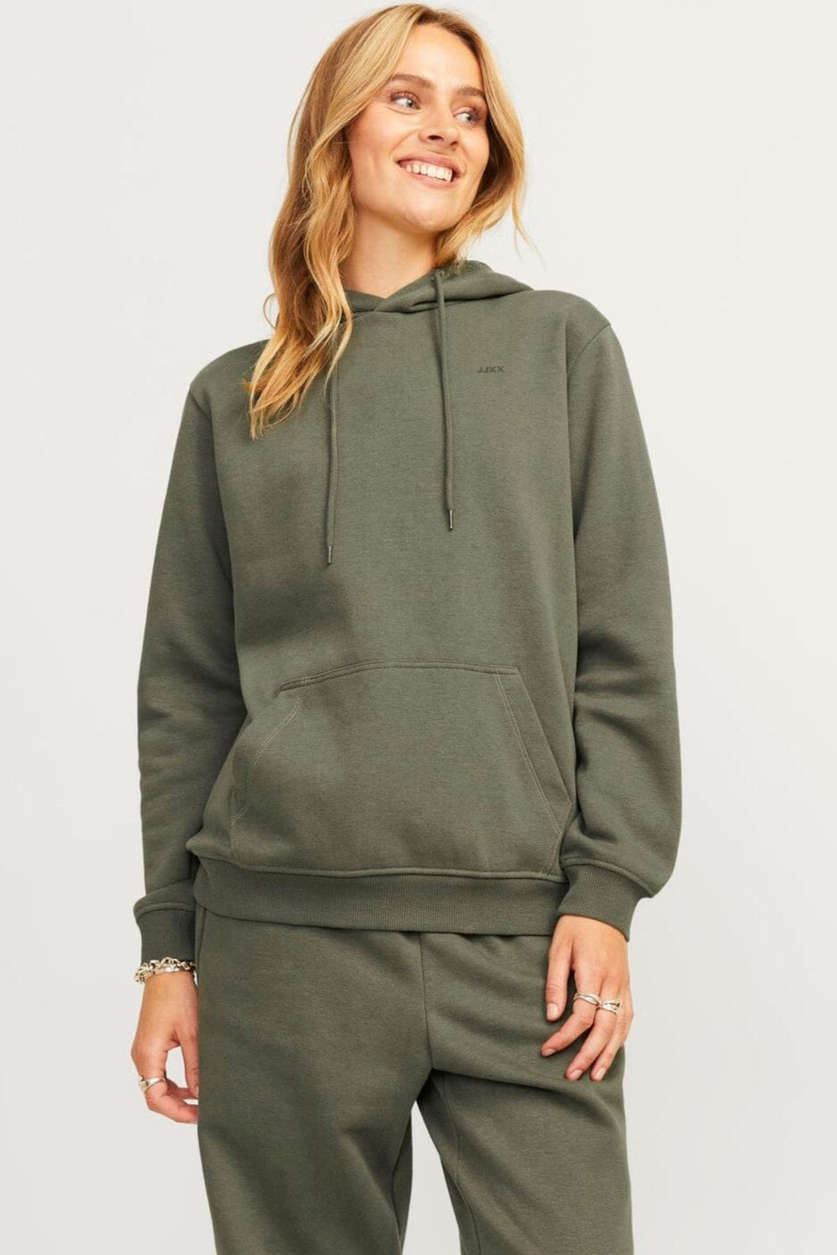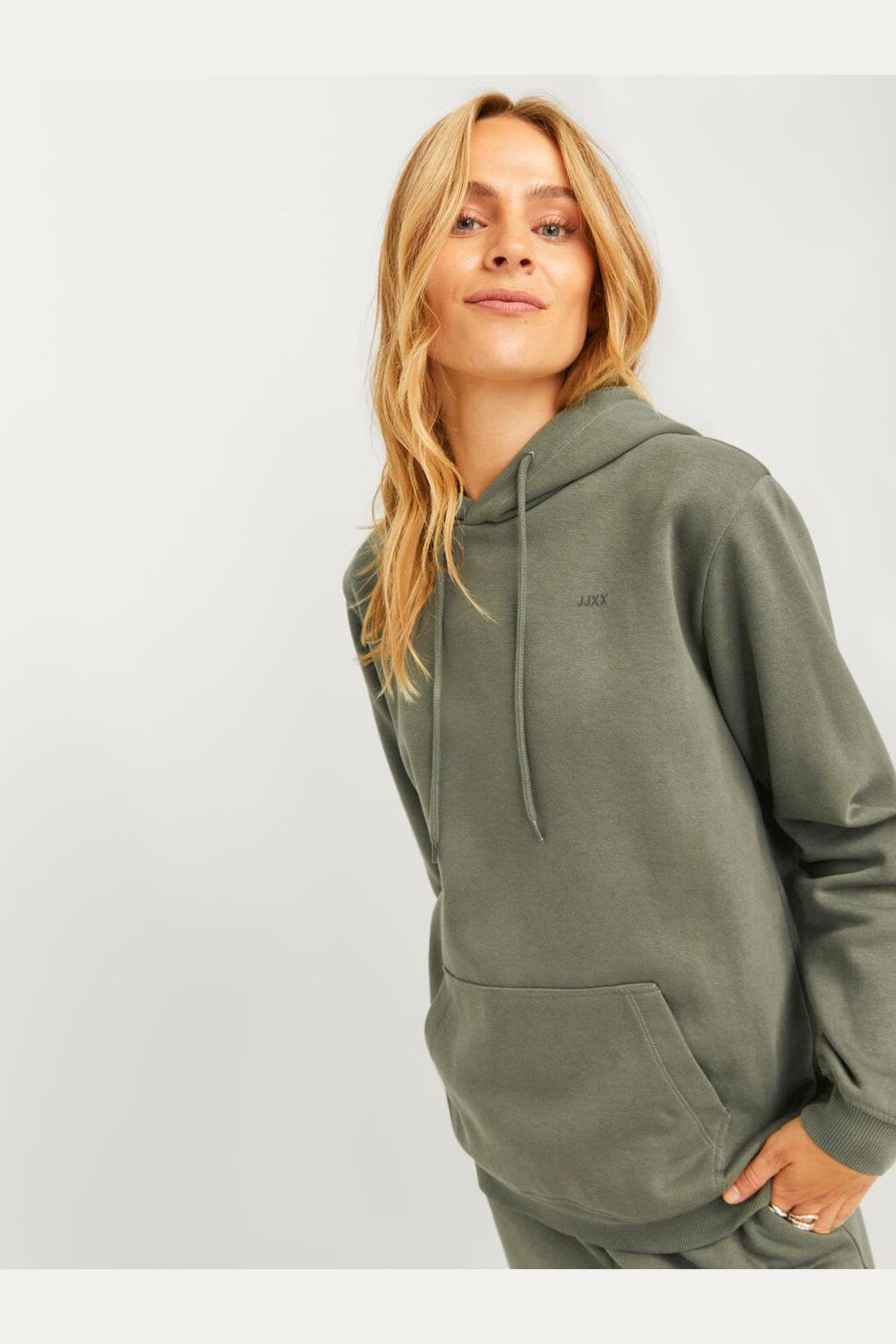 Zielona bluza z kapturem od Jjxx o luźnym kroju. Wykonana z miękkiej bawełny i przetworzonego poliestru z haftowanymi detalami i dyskretnym logo na piersi.