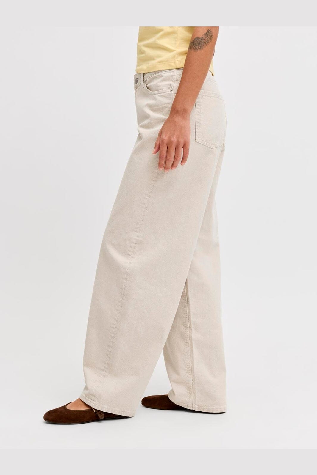 Jasne dżinsy JJXX z fasonem barrel-fit w jasnobeżowym kolorze. Dżinsy mają swobodny krój z szerokimi nogawkami i są wykonane z wytrzymałej denimowej tkaniny w splocie skośnym.