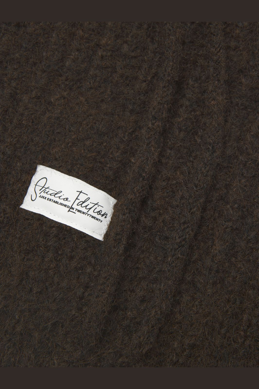 Brązowa balaclava od JJXX w płaskim splocie z zapięciem na sznurek. Posiada detal z naszywką i jest wykonana z mieszanki przetworzonego poliestru i wełny, co zapewnia ciepło w zimne dni.