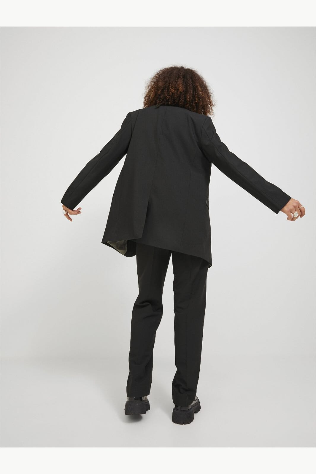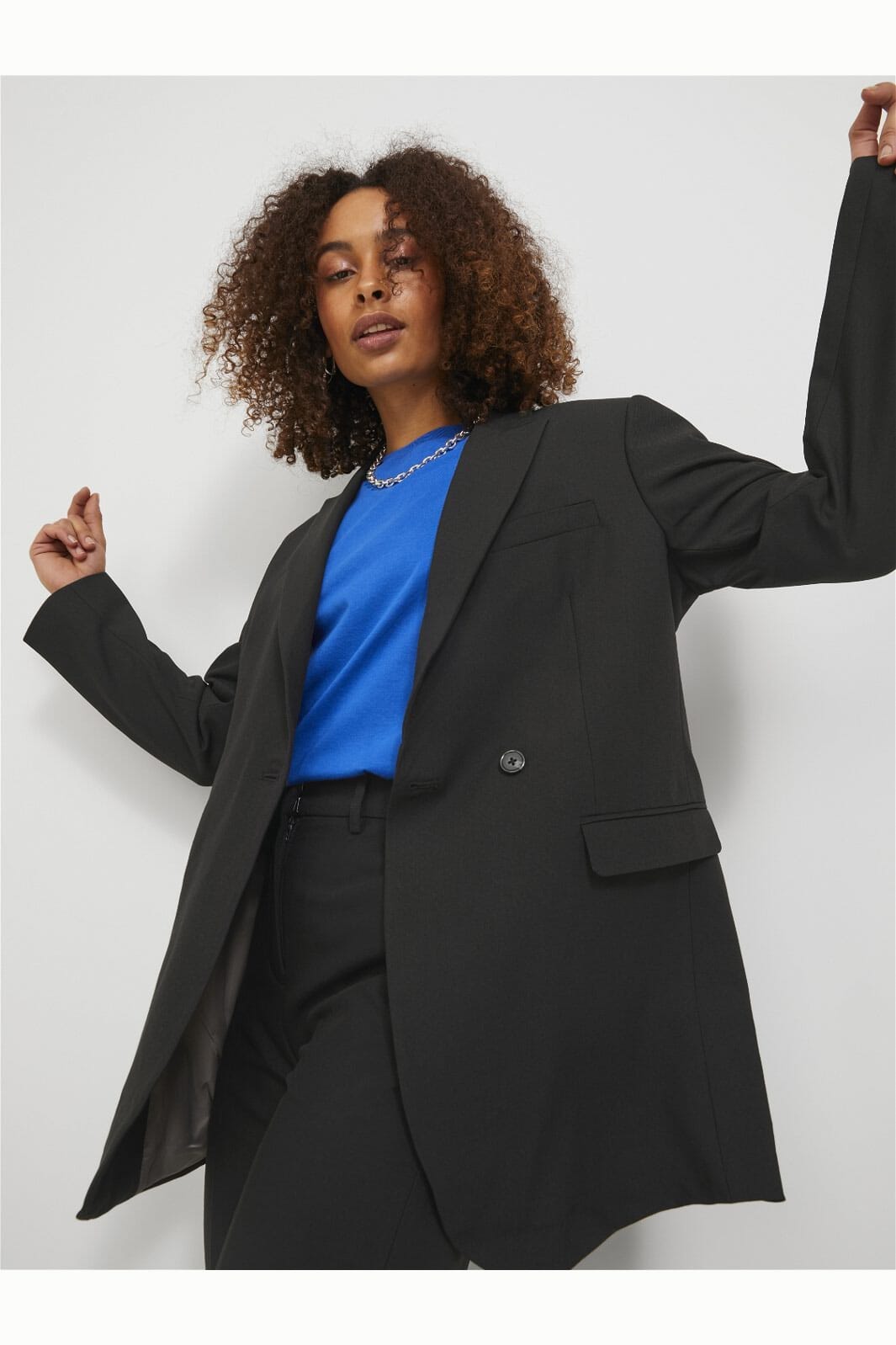 Czarna marynarka od Jjxx z podwójnym zapięciem na guziki. Posiada klapę i dwie kieszenie z przodu. Marynarka jest w pełni podszewkowana kontrastową podszewką.