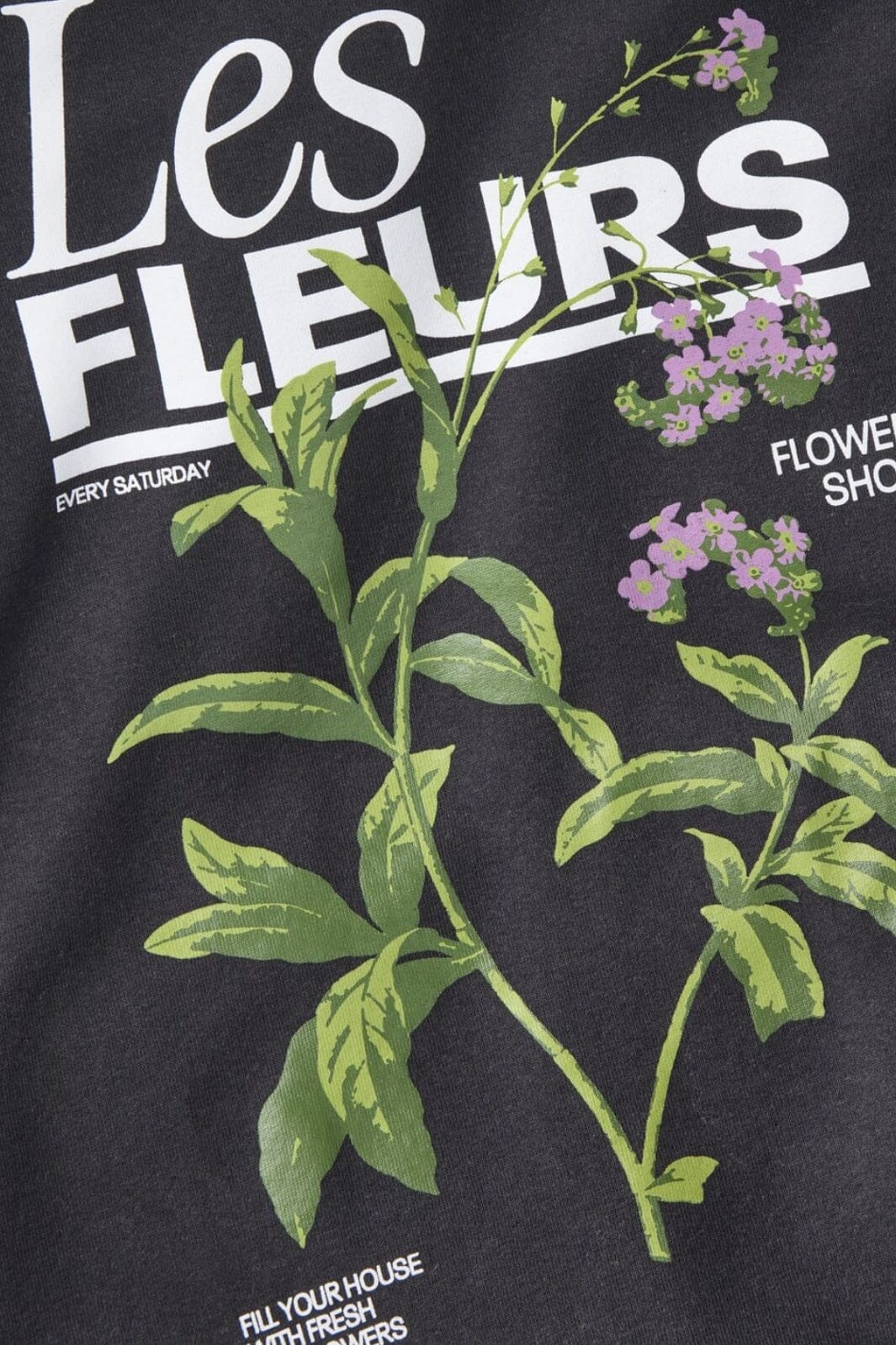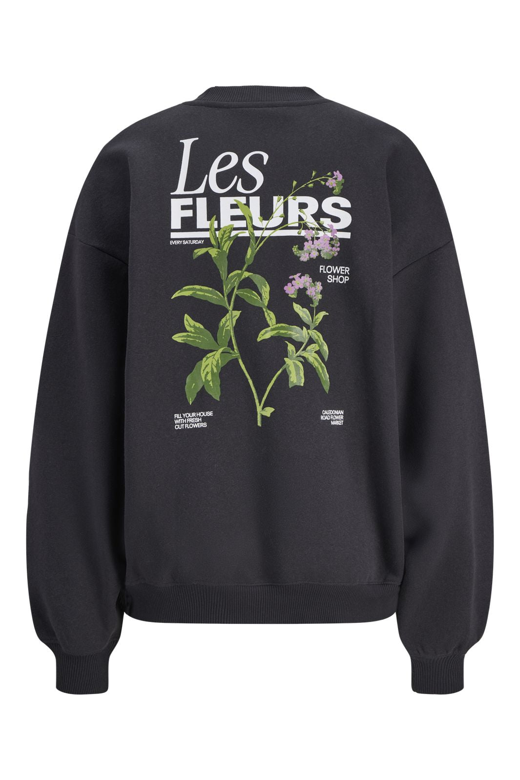 Czarna bluza od Jjxx o luźnym kroju. Z przodu znajduje się motyw kwiatowy z napisem Les Fleurs oraz zielonymi liśćmi i fioletowymi kwiatami z tyłu.