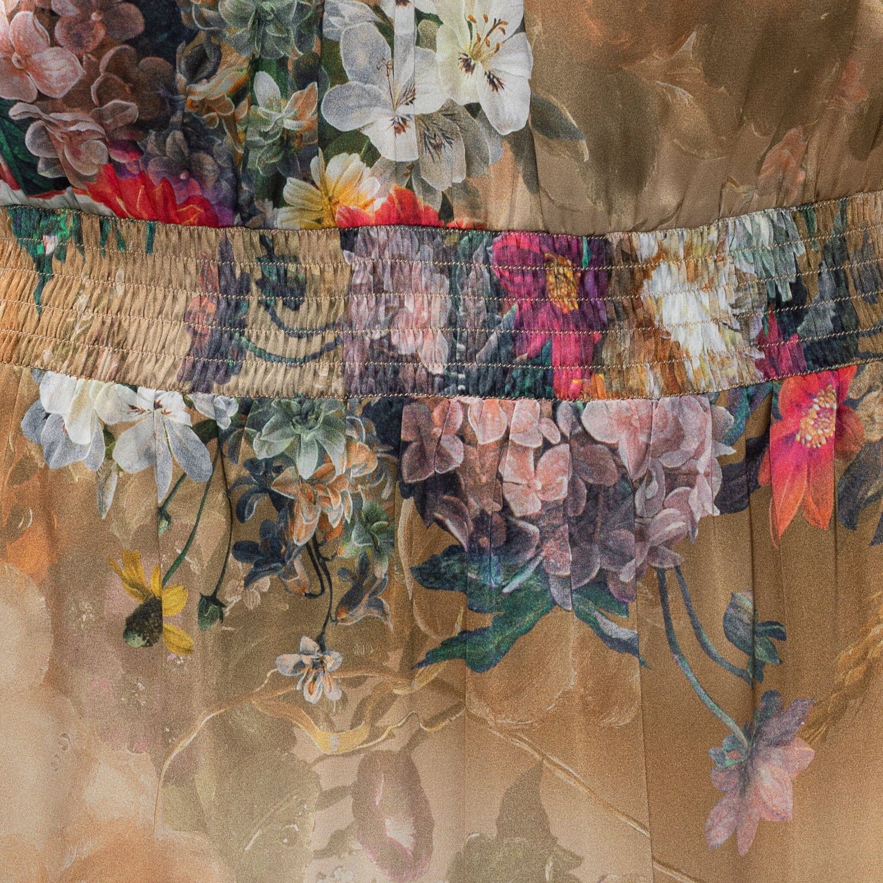 Sukienka marki Karmamia z kolorowym kwiatowym nadrukiem w odcieniach złota, różu i zieleni. Sukienka ma luźny krój i została zaprojektowana na przyjęcia i wesela.