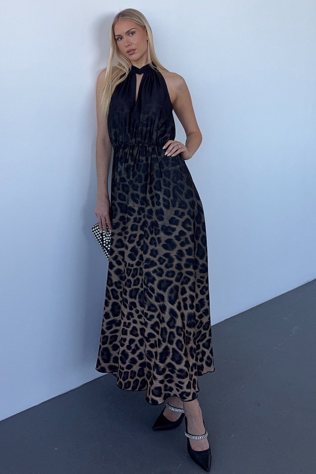 Długa sukienka od Karmamia w czarno-beżowym gradientowym wzorze lamparta. Sukienka ma dekolt w kształcie litery V połączony z halterneckiem oraz elastyczną talię, która zapewnia dużą swobodę ruchów.
