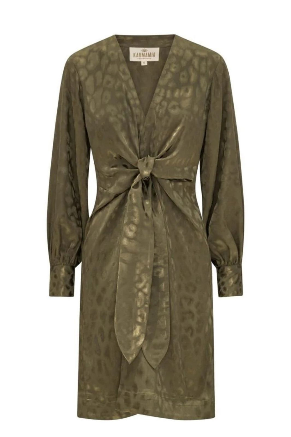 Czarna bluzka od Karmamia z lekko błyszczącą powierzchnią. Bluzka ma dekolt w serek i długie rękawy z marszczeniami przy ramionach.
