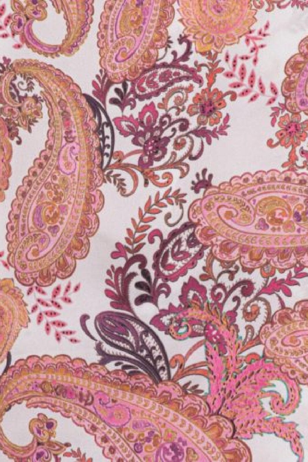 Top od Karmamia z wzorem paisley w różowym i białym kolorze na jasnym tle. Top ma wysoki kołnierz z designem halterneck i wiązanie na szyi.