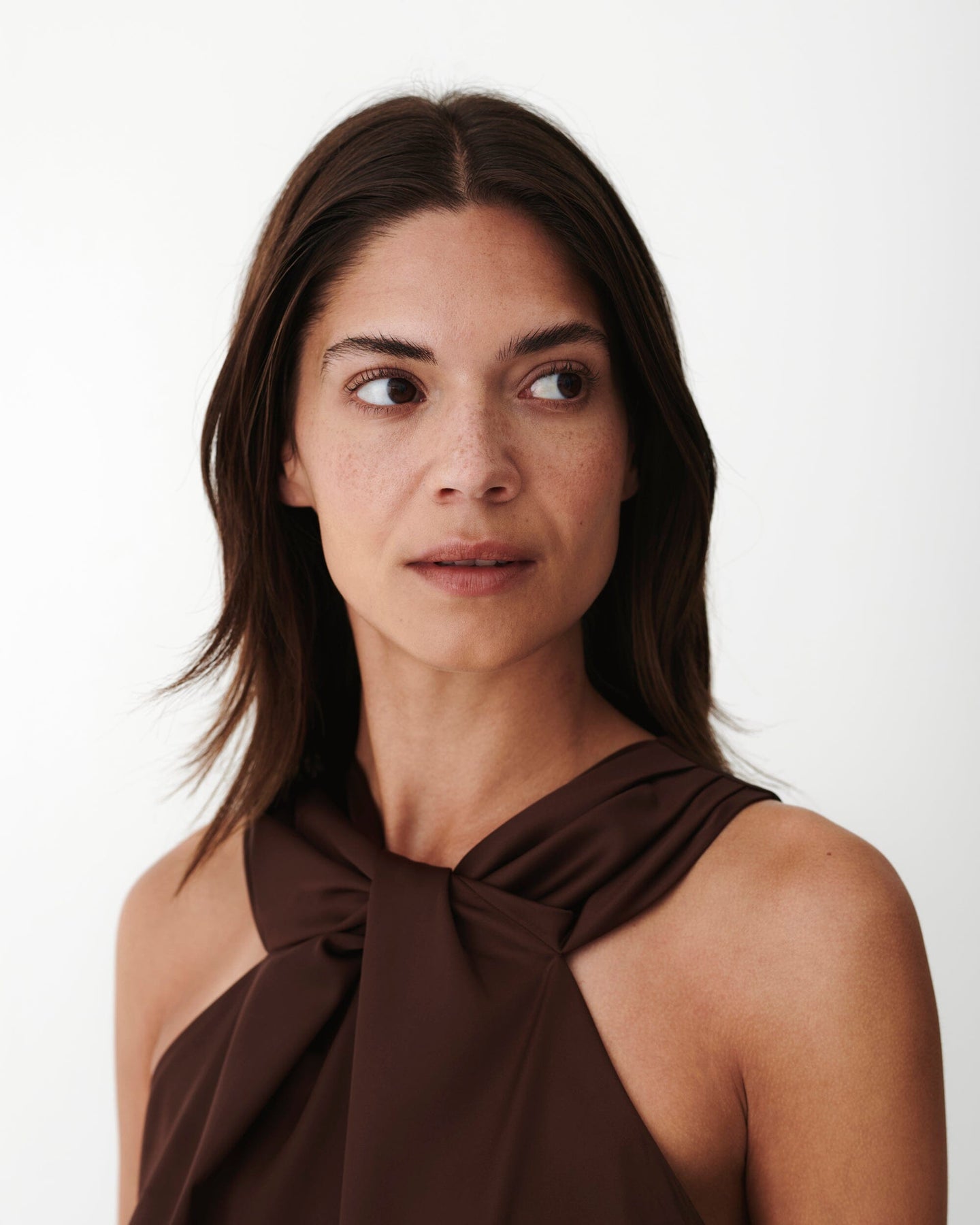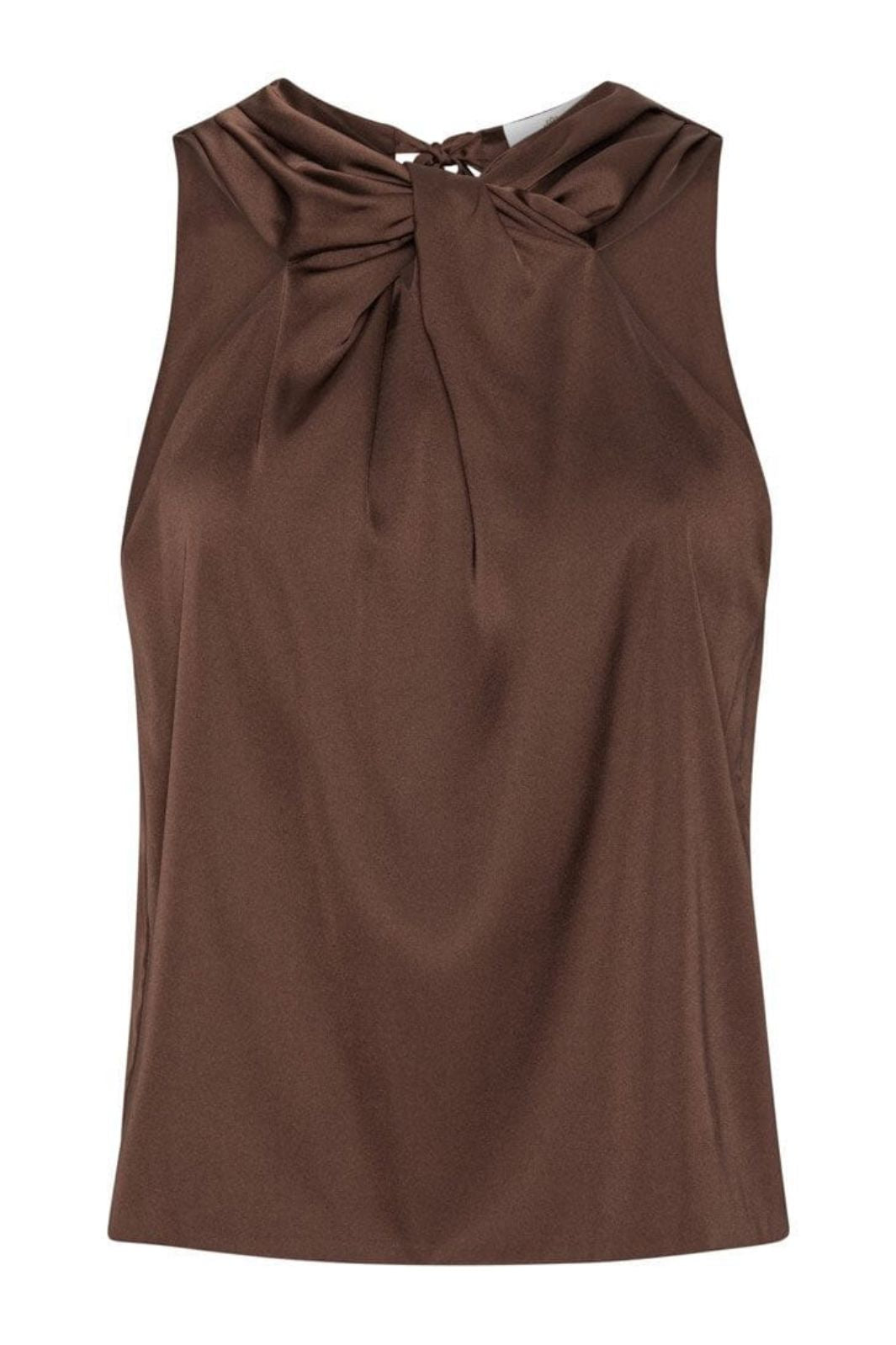 Brązowy top od Karmamia z wysokim kołnierzem i detalem w postaci węzła. Bezrękawnik ma regularny krój i zapina się na guziki. Top nadaje się zarówno na formalne, jak i na uroczyste okazje.
