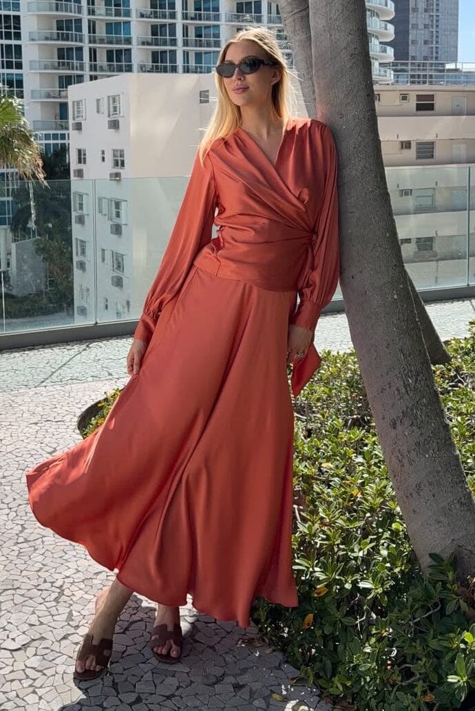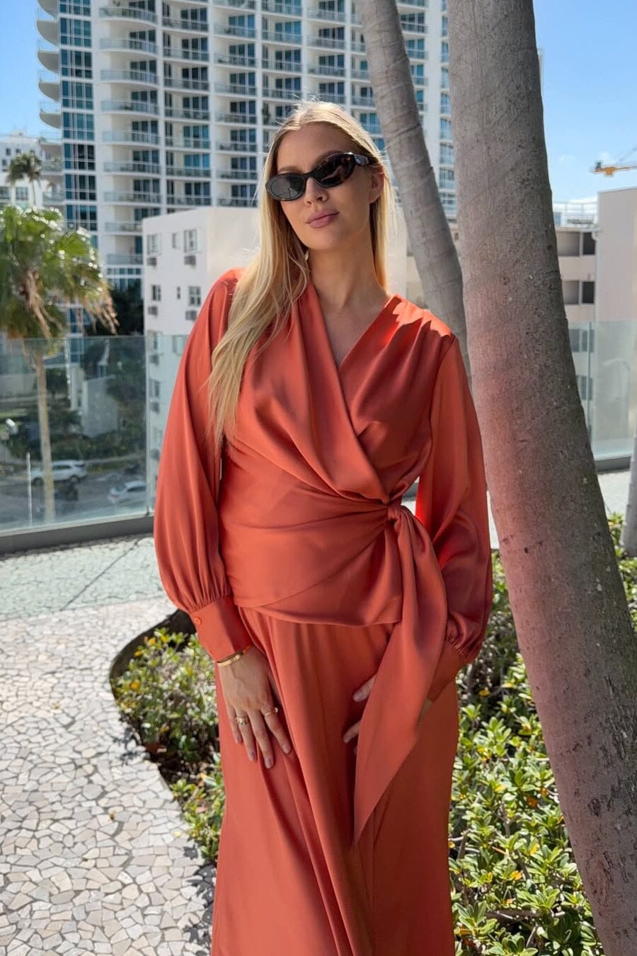 Bluzka kopertowa od Karmamia w pomarańczowym odcieniu. Bluzka ma dekolt w kształcie litery V oraz detal w postaci węzła z boku.