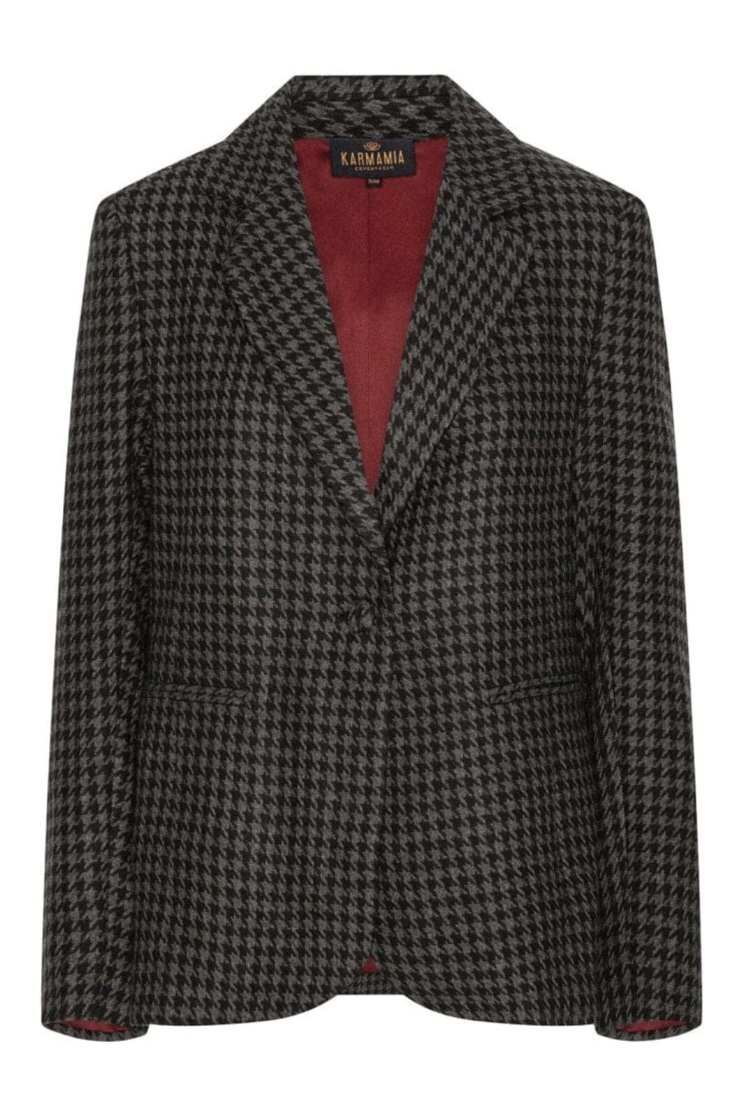 Marynarka od Karmamia w czarno-białym wzorze w jodełkę. Ma luźny krój z kołnierzykiem koszulowym, praktycznymi kieszeniami i czerwoną podszewką.