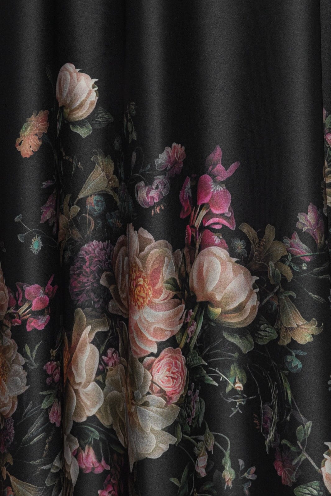 Czarna długa spódnica od Karmamia z kwiatowym wzorem. Ma różowe i kremowe kwiaty wzdłuż krawędzi na czarnym tle. Materiał ma miękką, satynową powierzchnię.
