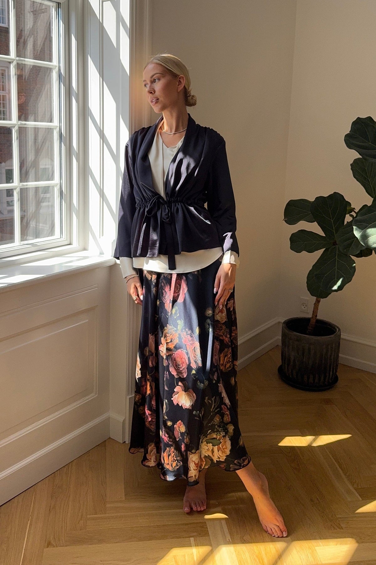 Czarna spódnica od Karmamia z kwiatowym wzorem w odcieniach różu, brzoskwini i kremu. Ma wysoki stan i sięga do połowy łydki. Materiał miękko opada i ma gładką powierzchnię.