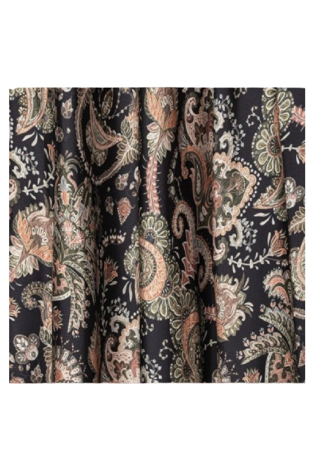 Długa spódnica od Karmamia z wzorem paisley w kolorze khaki, zielonym i czarnym. Spódnica ma wysoki stan i płynny krój z detalami falbanki.
