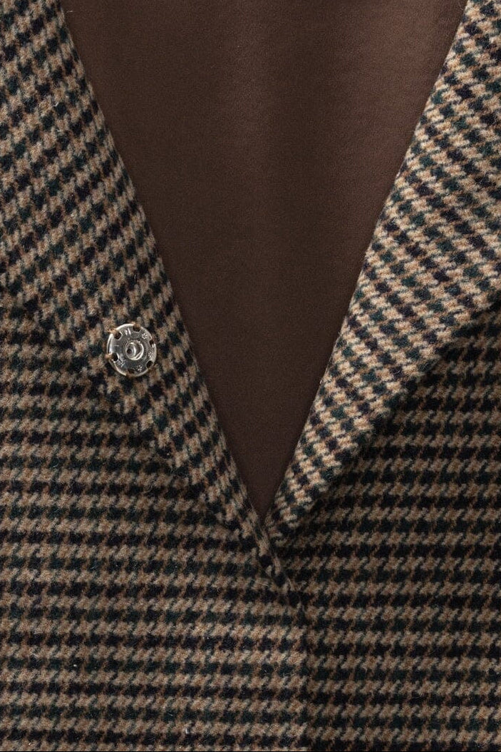 Kurtka od Karmamia w kratę w brązowych i beżowych odcieniach. Warstwa zewnętrzna wykonana jest z wełny, a podszewka z miękkiego satynowego poliestru.