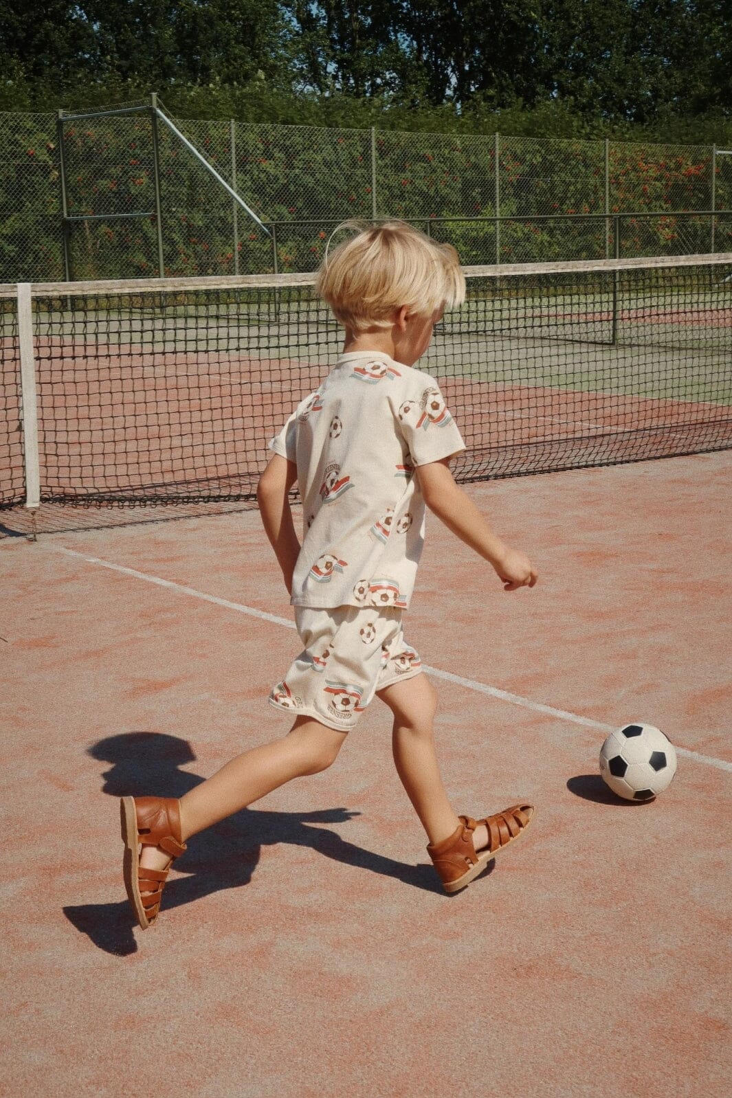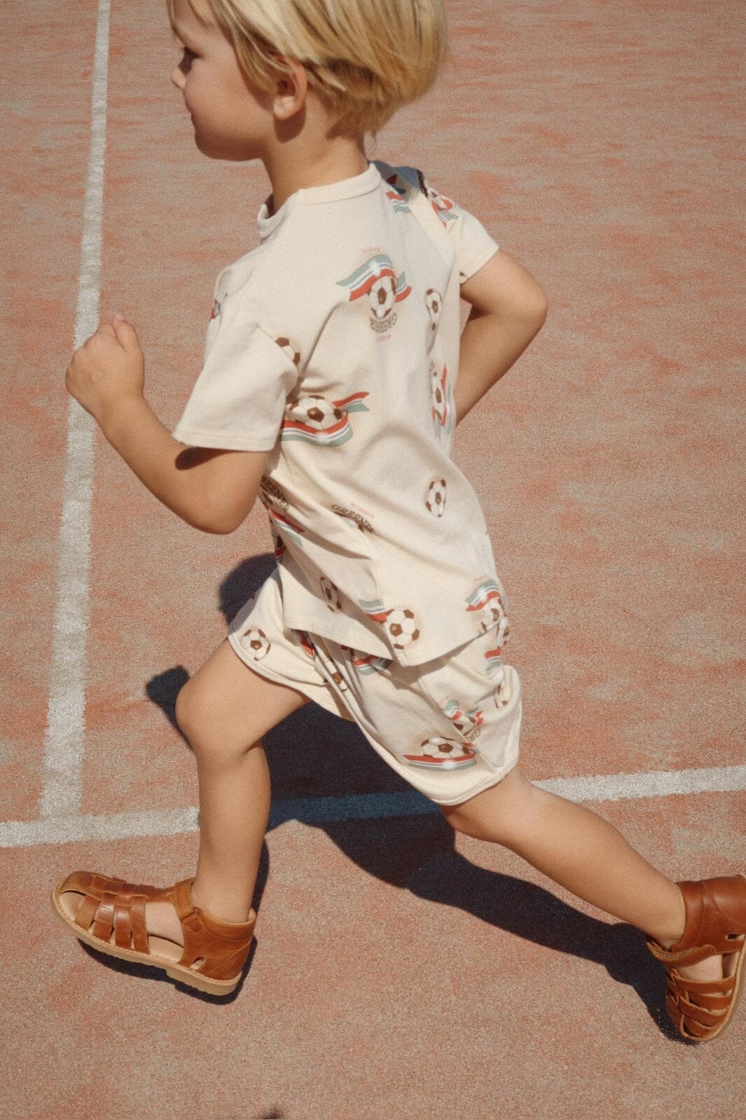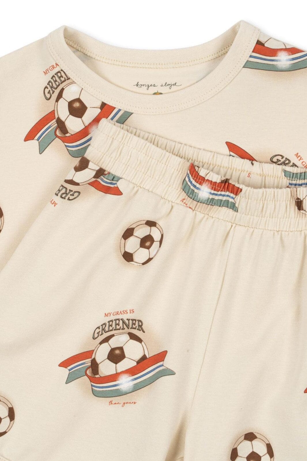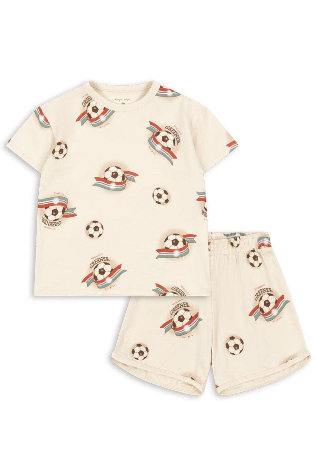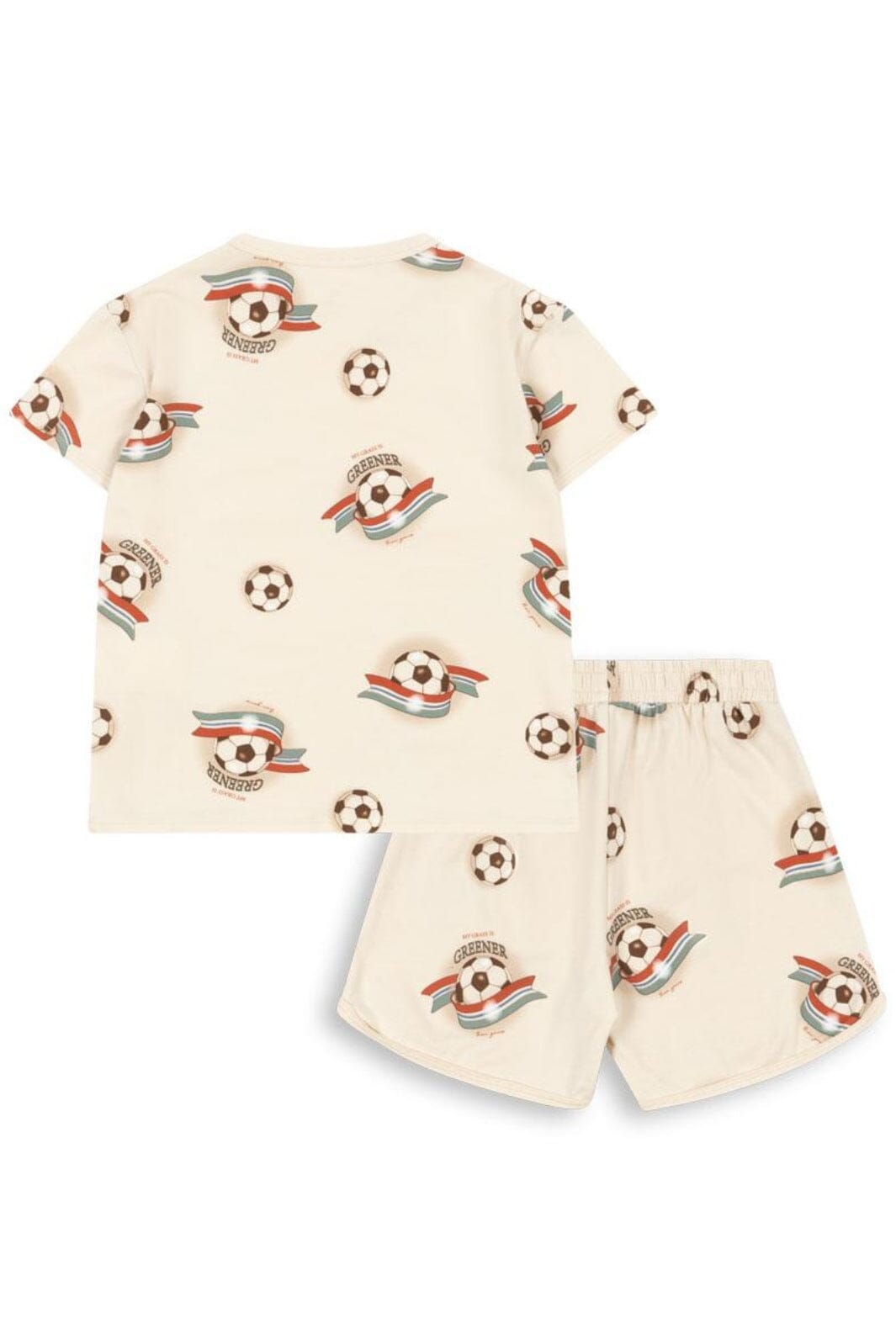 Zestaw certyfikowany GOTS od Konges Sløjd z T-shirtem i szortami na jasnym tle. Zestaw ma nadruk piłkarski oraz tekst MY GRASS IS GREENER, a także kolorowe detale.