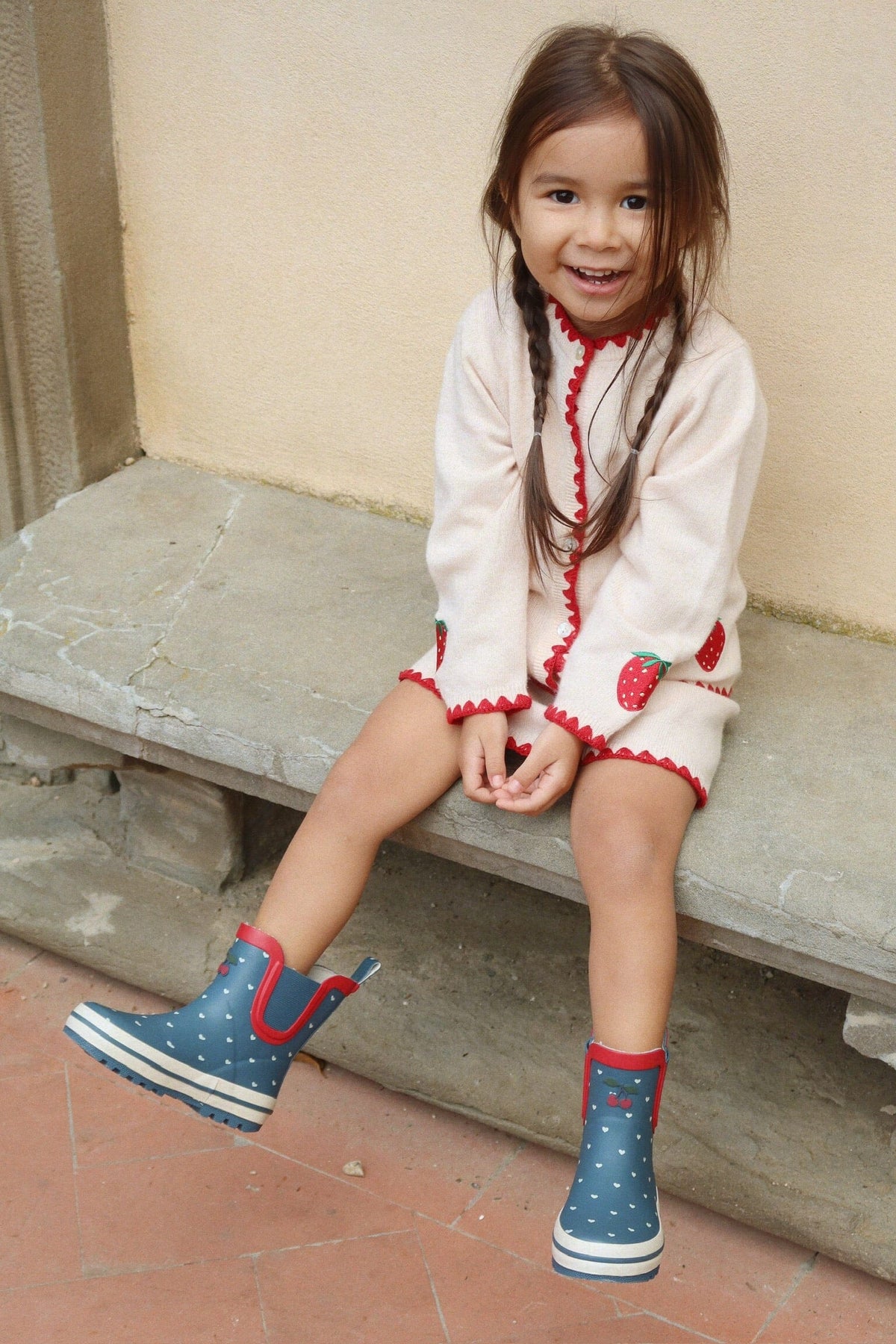 Jasnobeżowy kardigan od Konges Sløjd, wykonany z wełny, z haftowanymi motywami truskawek oraz czerwonym zygzakowatym wzorem wzdłuż krawędzi.