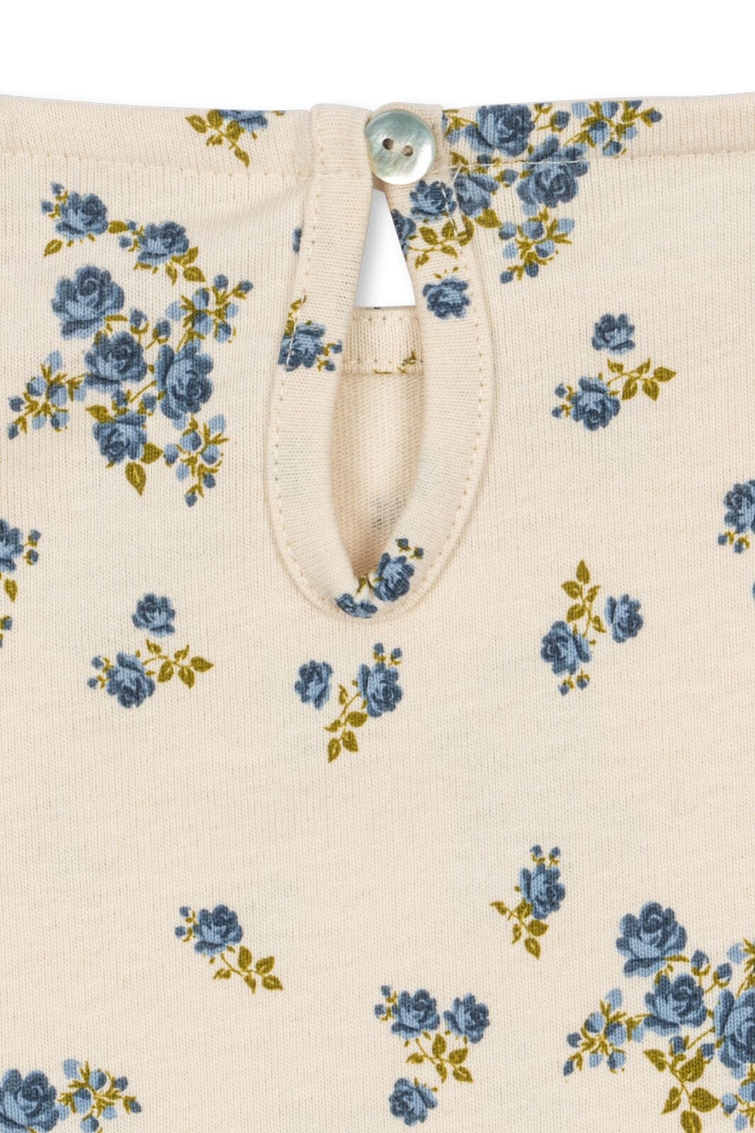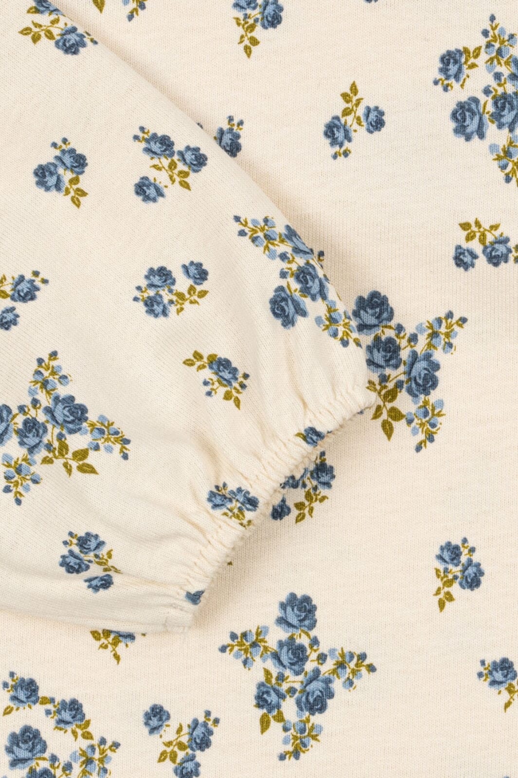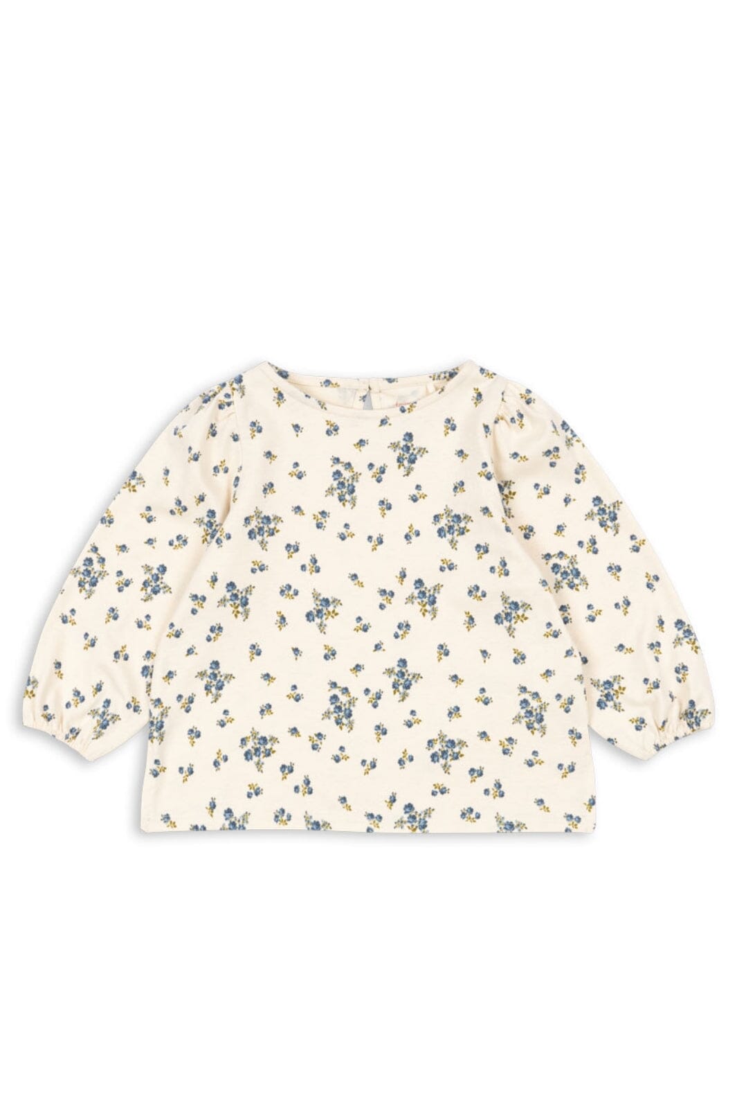 Bluzka od Konges Sløjd w drobne niebieskie kwiaty na jasnym tle. Bluzka ma długie rękawy i okrągły dekolt.
