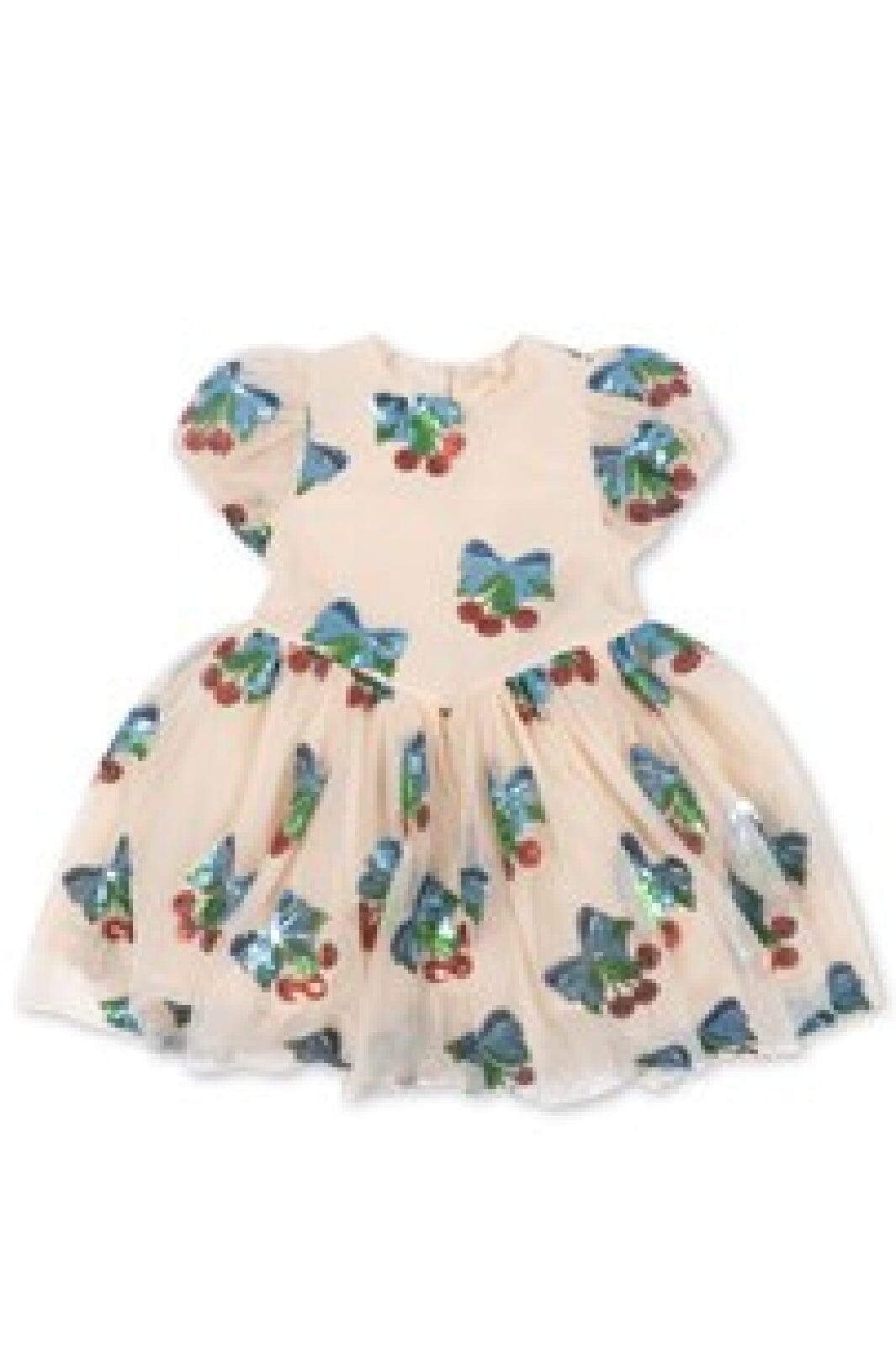 Sukienka od Konges Sløjd z cekinami w motywy motyli i wiśni na białym tle. Bufiaste rękawy i okrągły dekolt nadają sukience zabawny wyraz.